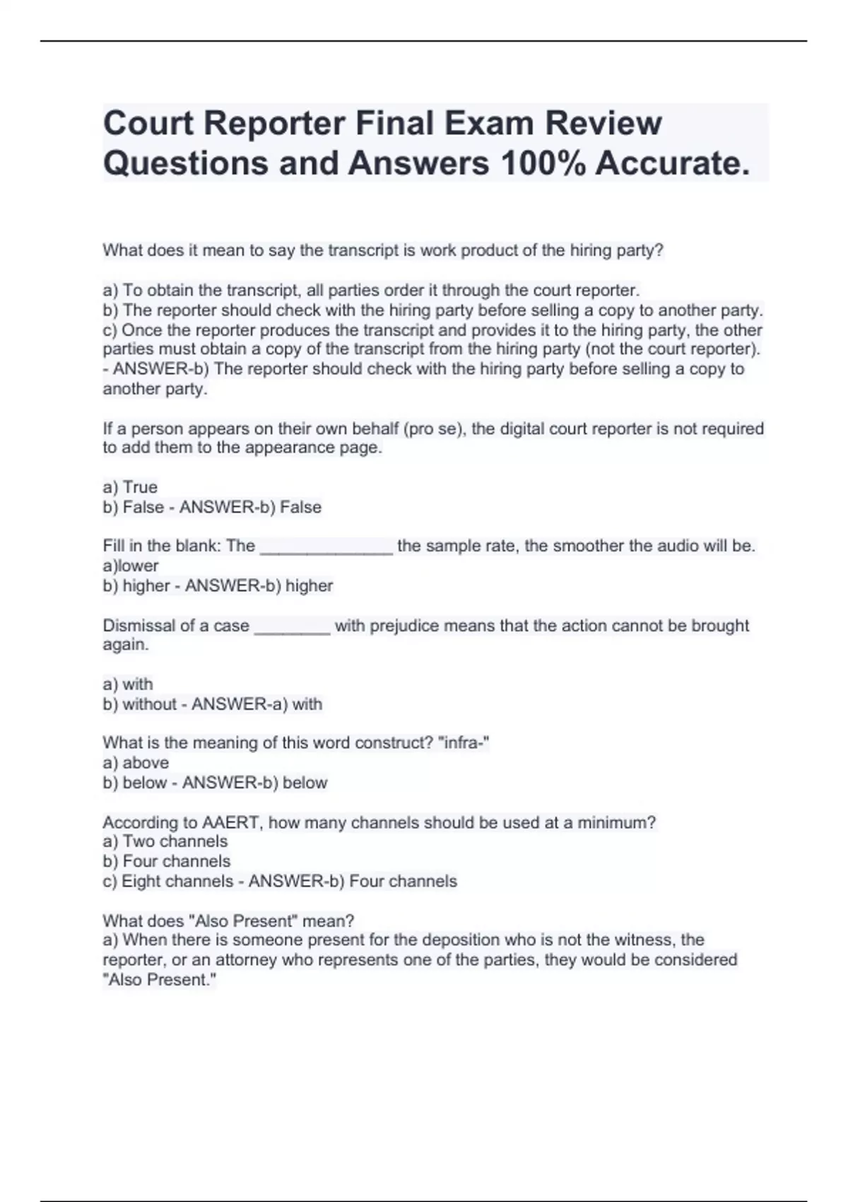 What does it mean to say the transcript is work product of the hiring party? a) To obtain the transcript, all parties order it through the court reporter. b) The reporter should check with the hiring party before selling a copy to another party. c) Once the reporter produces the transcript and provides it to the hiring party, the other parties must obtain a copy of the transcript from the hiring party (not the court reporter). - ANSWER-b) The reporter should check with the hiring party before selling a copy to another party. If a person appears on their own behalf (pro se), the digital court reporter is not required to add them to the appearance page. a) True b) False - ANSWER-b) False Fill in the blank: The ______________ the sample rate, the smoother the audio will be. a)lower b) higher - ANSWER-b) higher Dismissal of a case ________ with prejudice means that the action cannot be brought again. a) with b) without - ANSWER-a) with What is the meaning of this word construct? "infra-" a) above b) below - ANSWER-b) below According to AAERT, how many channels should be used at a minimum? a) Two channels b) Four channels c) Eight channels - ANSWER-b) Four channels What does "Also Present" mean? a) When there is someone present for the deposition who is not the witness, the reporter, or an attorney who represents one of the parties, they would be considered "Also Present." b) If there are two attorneys from the same law firm, only one is an "Appearance" and the other is an "Also Present." c) When there are people present for a hearing or trial who is not part of the case, they would be considered "Also Present." d) When there are two attorneys from different law firms who are present, and both represent the same party as co-counsel. - ANSWER-a) When there is someone present for the deposition who is not the witness, the reporter, or an attorney who represents one of th
