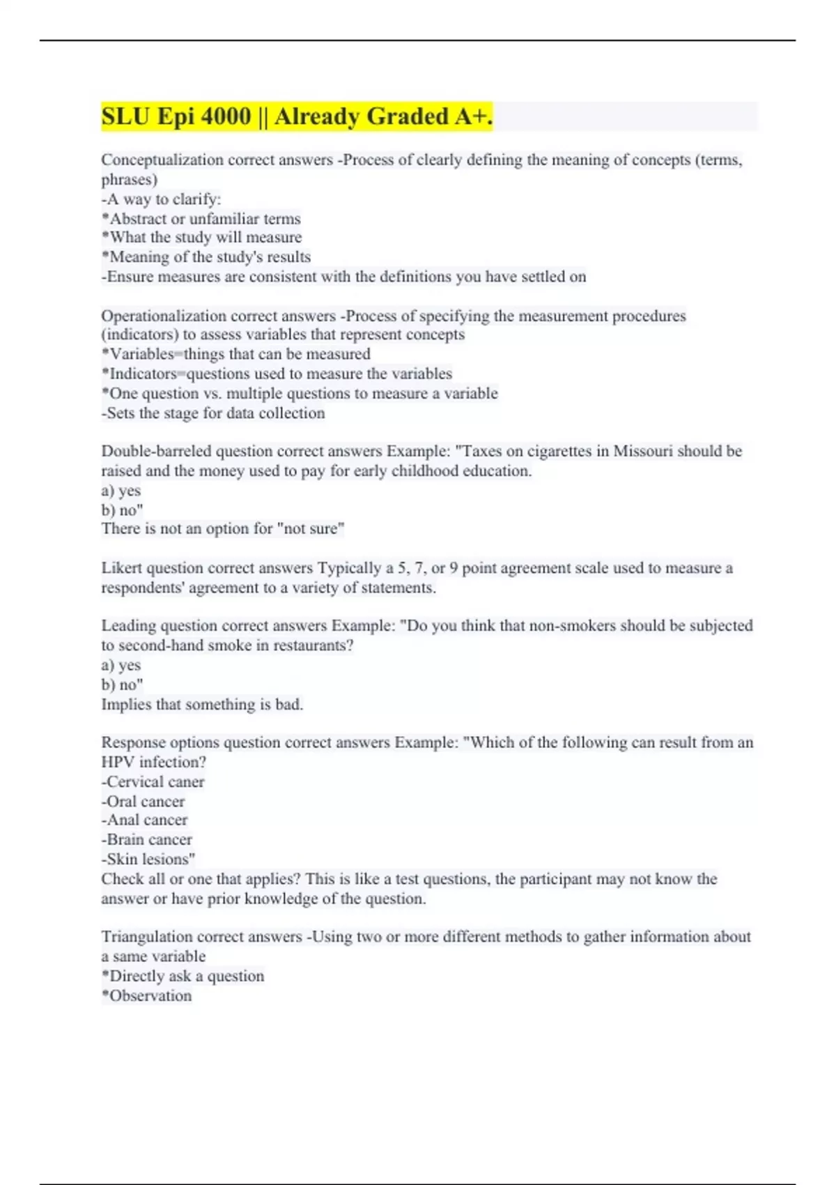 Conceptualization correct answers -Process of clearly defining the meaning of concepts (terms, phrases) -A way to clarify: *Abstract or unfamiliar terms *What the study will measure *Meaning of the study's results -Ensure measures are consistent with the definitions you have settled on Operationalization correct answers -Process of specifying the measurement procedures (indicators) to assess variables that represent concepts *Variables=things that can be measured *Indicators=questions used to measure the variables *One question vs. multiple questions to measure a variable -Sets the stage for data collection Double-barreled question correct answers Example: "Taxes on cigarettes in Missouri should be raised and the money used to pay for early childhood education. a) yes b) no" There is not an option for "not sure" Likert question correct answers Typically a 5, 7, or 9 point agreement scale used to measure a respondents' agreement to a variety of statements. Leading question correct answers Example: "Do you think that non-smokers should be subjected to second-hand smoke in restaurants? a) yes b) no" Implies that something is bad. Response options question correct answers Example: "Which of the following can result from an HPV infection? -Cervical caner -Oral cancer -Anal cancer -Brain cancer -Skin lesions" Check all or one that applies? This is like a test questions, the participant may not know the answer or have prior knowledge of the question. Triangulation correct answers -Using two or more different methods to gather information about a same variable *Directly ask a question *Observation