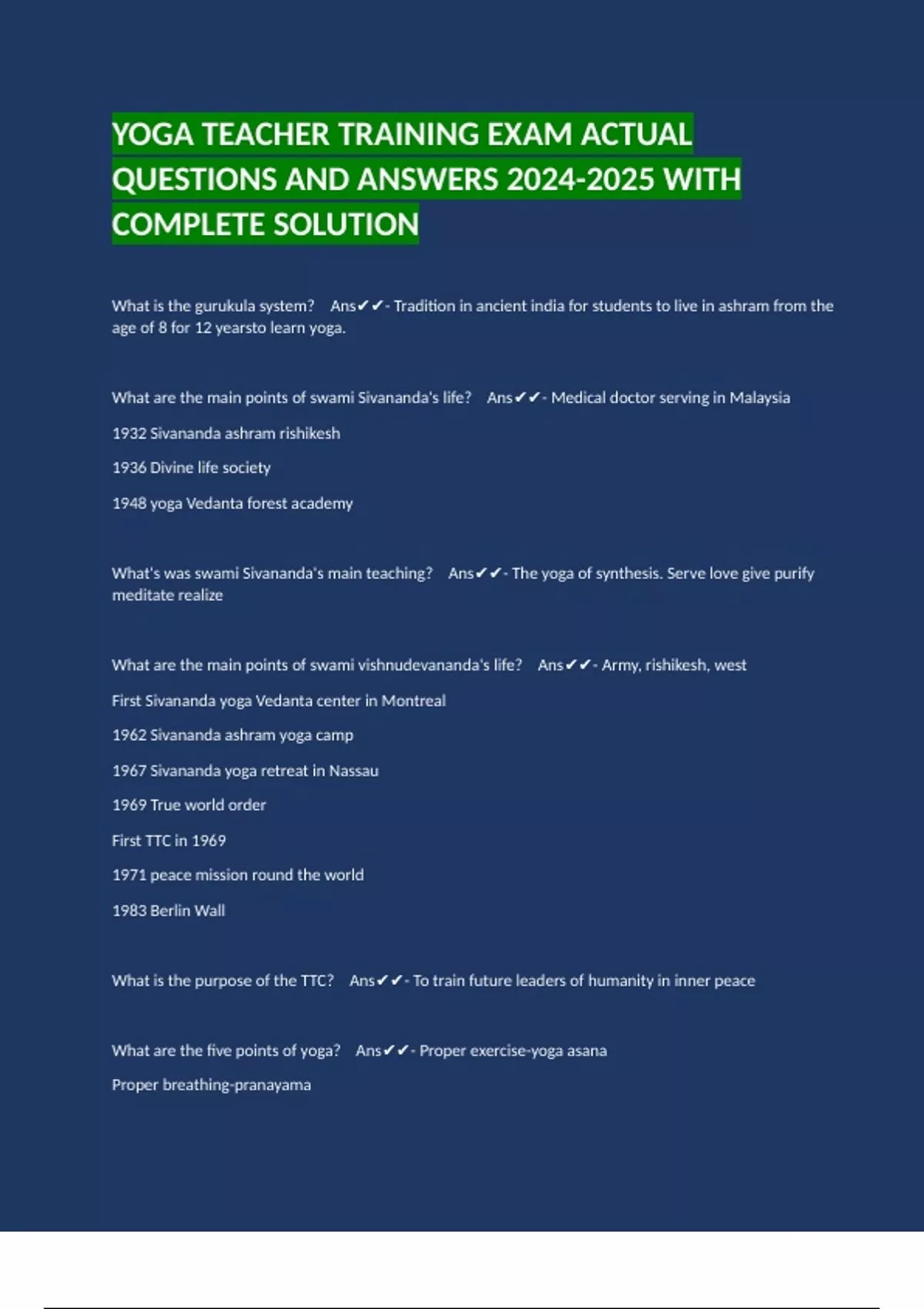 YOGA TEACHER TRAINING EXAM ACTUAL QUESTIONS AND ANSWERS WITH COMPLETE SOLUTION What is the gurukula system? Ans- Tradition in ancient india for students to live in ashram from the age of 8 for 12 yearsto learn yoga. What are the main points of swami Sivananda's life? Ans- Medical doctor serving in Malaysia 1932 Sivananda ashram rishikesh 1936 Divine life society 1948 yoga Vedanta forest academy What's was swami Sivananda's main teaching? Ans- The yoga of synthesis. Serve love give purify meditate realize What are the main points of swami vishnudevananda's life? Ans- Army, rishikesh, west First Sivananda yoga Vedanta center in Montreal 1962 Sivananda ashram yoga camp 1967 Sivananda yoga retreat in Nassau 1969 True world order First TTC in 1969 1971 peace mission round the world 1983 Berlin Wall What is the purpose of the TTC? Ans- To train future leaders of humanity in inner peace What are the five points of yoga? Ans- Proper exercise-yoga asana Proper breathing-pranayama Proper relaxation-savasana Proper diet-vegetarian/sattvic Positive thinking and meditation- vedanta and dhyana What are the four obstacles to the spiritual path? Ans- Preconceived ideas: set expectations that when not met, cause disharmony in your sadhana Miscellaneous thoughts of ideas and duty: mind deprioritizes sadhana Opposition from friends and family Mind is unwilling to follow discipline What is Brahman? Ans- ultimate reality What is Atman? Ans- the self What are the upadhis? Ans- Limiting adjuncts: body and mind. What is maya? Ans- Creative power of brahman What is satchitananda? Ans- Existence pure consciousness and bliss absolute What is Vedanta? Ans- The concluding section of the vedas What is avidya? Ans- ignorance What is isvara? Ans- Brahman assuming qualities What is jiva? Ans- Individual soul (ignorance) How did adi shankaracharya summarize advaita Vedanta? Ans- Brahman alone is real The world is an appearance The jiva and Brahman are essentially not different What does advaita mean? Ans- Non dual What are the three gunas? Ans- sattva, rajas, tamas What are the four types of students? Ans- Sattvic A: gunpowder- only needs a spark Sattvic B: dry wood- has a clear understanding of the path. Has discrimination and dispassion (viveka and vairagya) Rajasic: wet wood- preaches, doesn't practice. Seeks egotistical ends Tamasic: green wood- accepts no discipline What are the four types of teachers? Ans- Sattvic A: self realized, true guru, has disciples Sattvic B: has experienced the inner silence Rajasic: has followers, gimmicks, doesn't practice what he preaches Tamasic: preaches violence in the name of spirituality What are the seven bhoomikas? Ans- Subecha: longing for truth Vicharana: right enquiry Tanumanasa: thinning of the mind Sattvapati: attainment of sattva Asamshakti: transcending powers of creation Padarthabhavani: brahman is all Turya: the fourth What are the four paths of yoga and what do they mean? Ans- Karma yoga- yoga of action Bakti yoga- yoga of devotion