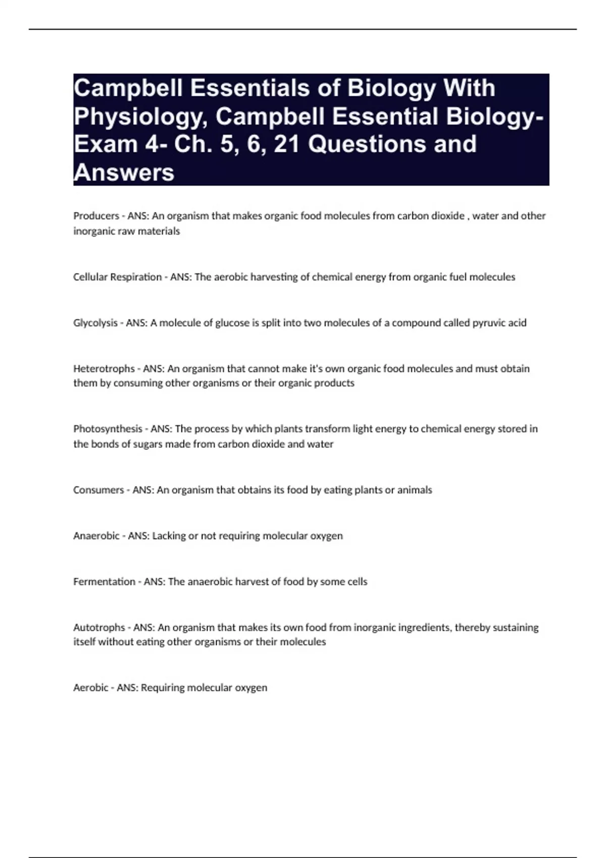 Campbell Essentials of Biology With Physiology, Campbell Essential Biology- Exam 4- Ch. 5, 6, 21 Questions and Complete Solutions