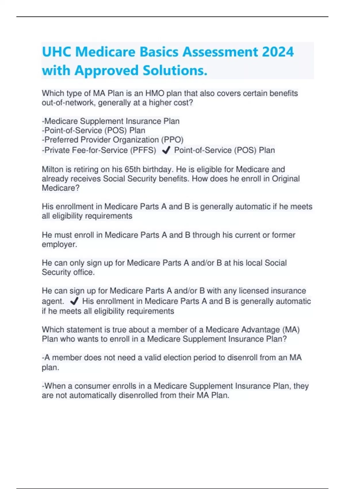 Which type of MA Plan is an HMO plan that also covers certain benefits out-of-network, generally at a higher cost? -Medicare Supplement Insurance Plan -Point-of-Service (POS) Plan -Preferred Provider Organization (PPO) -Private Fee-for-Service (PFFS) ️ Point-of-Service (POS) Plan Milton is retiring on his 65th birthday. He is eligible for Medicare and already receives Social Security benefits. How does he enroll in Original Medicare? His enrollment in Medicare Parts A and B is generally automatic if he meets all eligibility requirements He must enroll in Medicare Parts A and B through his current or former employer. He can only sign up for Medicare Parts A and/or B at his local Social Security office. He can sign up for Medicare Parts A and/or B with any licensed insurance agent. ️ His enrollment in Medicare Parts A and B is generally automatic if he meets all eligibility requirements Which statement is true about a member of a Medicare Advantage (MA) Plan who wants to enroll in a Medicare Supplement Insurance Plan? -A member does not need a valid election period to disenroll from an MA plan. -When a consumer enrolls in a Medicare Supplement Insurance Plan, they are not automatically disenrolled from their MA Plan