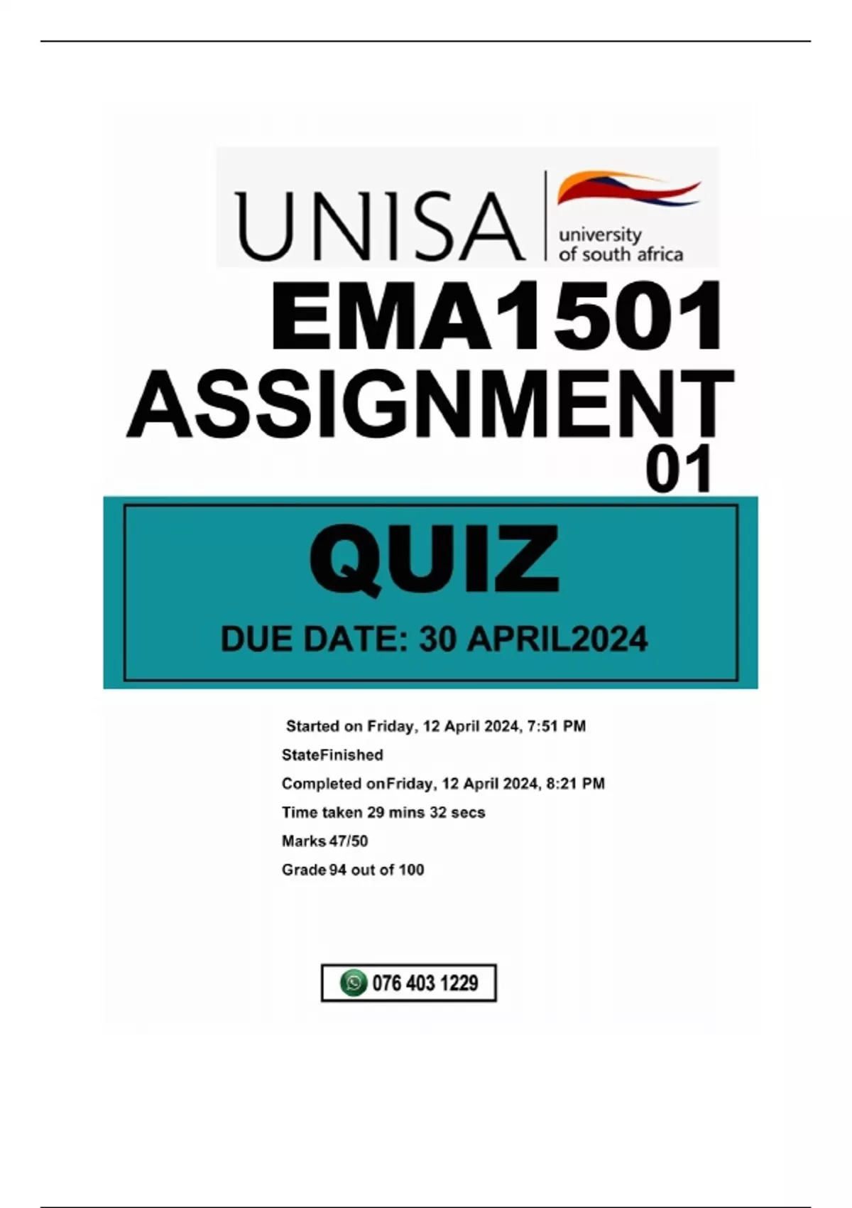 EMA1501 ASSIGNMENT 01 (QUIZ) DUE 30APRIL 2024