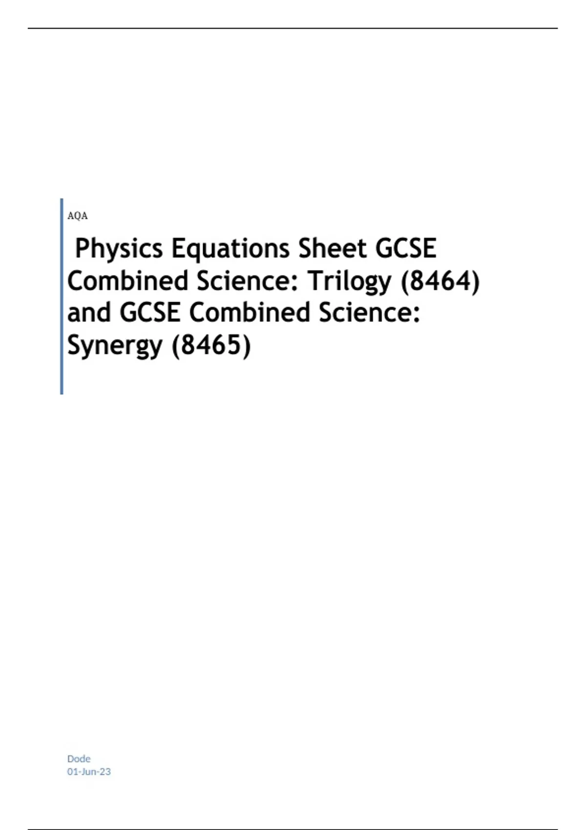 AQA Physics Equations Sheet GCSE Combined Science: Trilogy (8464) and GCSE Combined Science: Synergy (8465)