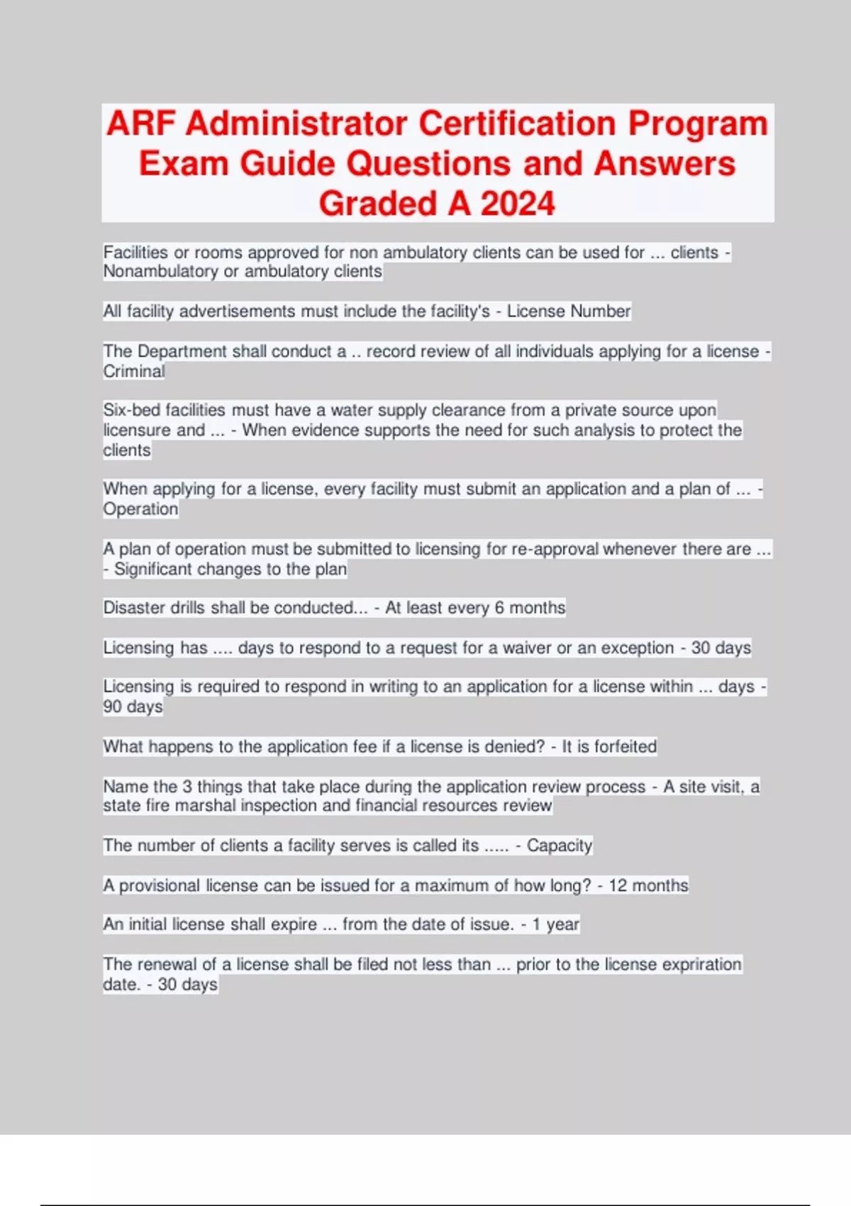 Facilities or rooms approved for non ambulatory clients can be used for ... clients - Nonambulatory or ambulatory clients All facility advertisements must include the facility's - License Number The Department shall conduct a .. record review of all individuals applying for a license - Criminal Six-bed facilities must have a water supply clearance from a private source upon licensure and ... - When evidence supports the need for such analysis to protect the clients When applying for a license, every facility must submit an application and a plan of ... - Operation A plan of operation must be submitted to licensing for re-approval whenever there are ... - Significant changes to the plan Disaster drills shall be conducted... - At least every 6 months Licensing has .... days to respond to a request for a waiver or an exception - 30 days Licensing is required to respond in writing to an application for a license within ... days - 90 days What happens to the application fee if a license is denied? - It is forfeited Name the 3 things that take place during the application review process - A site visit, a state fire marshal inspection and financial resources review The number of clients a facility serves is called its ..... - Capacity A provisional license can be issued for a maximum of how long? - 12 months An initial license shall expire ... from the date of issue. - 1 year The renewal of a license shall be filed not less than ... prior to the license expriration date. - 30 days What must a facility do when they change their location or increase their capacity? - File a new application A license can be transferred to a new owner. True or false - False The initial application fee for a 6-bed home is ....? - $300 When an application for an initial licensing is denied the licensing agency shall....? - Notify the applicant of the reasons for the denial and advise them of their right to appeal What is TSO? - A temporary suspension order which temporarily suspends a license prior to an administrative hearing When is TSO issued? - When the Department believes there is an urgent need to protect residents of a facility from physical or mental abuse or any other substantial threat to health or safety. Licensing will conduct a follow-up inspection of a facility for which a license was issued within ... days. - 90 days Licensing evaluations will be conducted how often? - At least once a year When a complaint is made licensing, licensing shall make an on-site inspection within what time frame? - 10 days How many days after a plan of correction date is submitted to licensing is a follow up visit conducted? - 10 days How long does the licensee have to report by telephone a special incident to licensing? - By the next working day during normal business hours. How long does the license have to report a special incident in writing to licensing? - Within 7 days How long does the licensee have to report the death of a client to licensing? - By telephone: the next working day. In writing: within 7 days How long does the licensee have to report fa change of the CEO or licensee's mailing address? - 10 working days To whom must the licensee report an epidemic outbreak? - To licensing and the local health officer To whom must a licensee report a fire at their facility? - To licensing and to the local fire authority