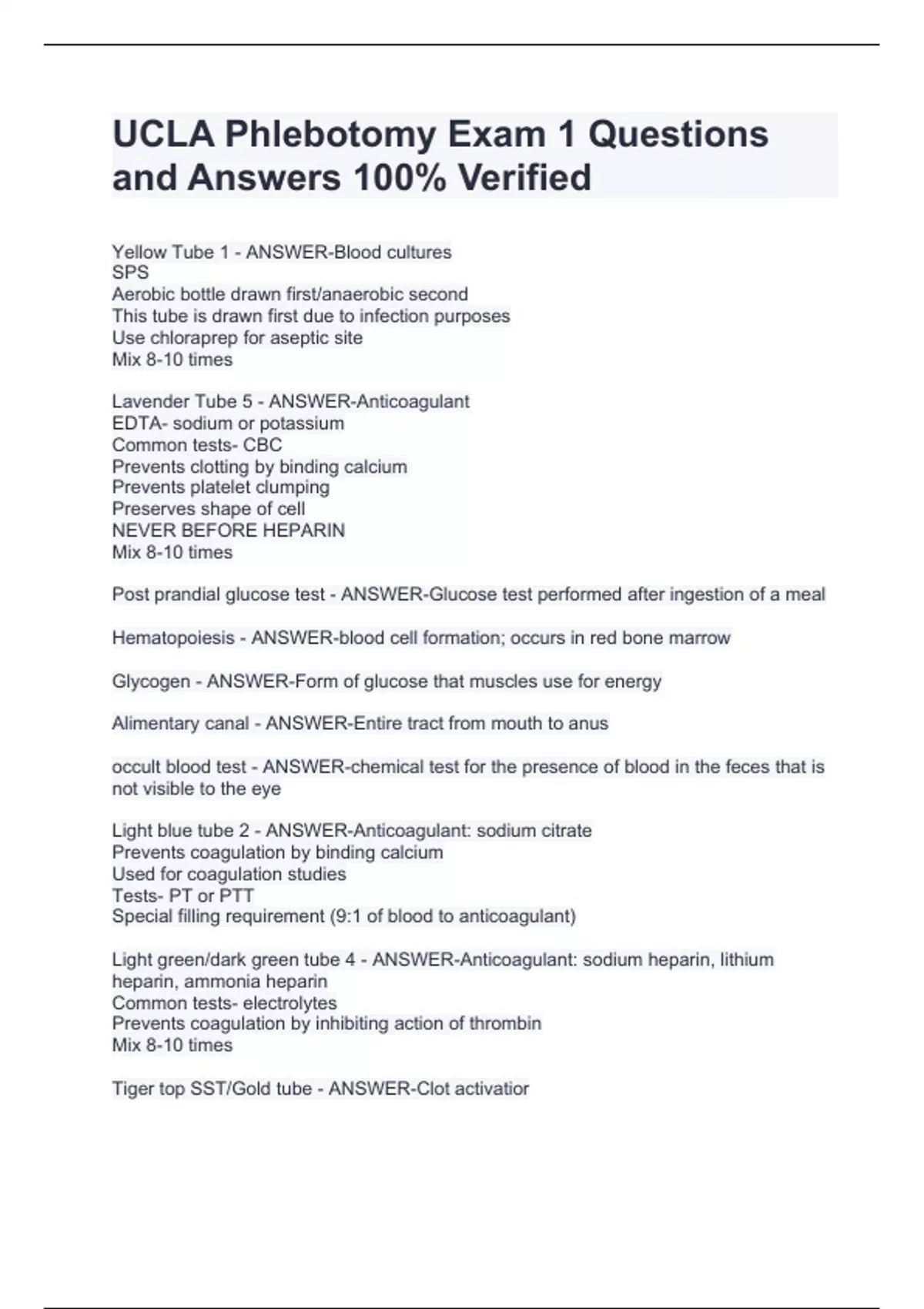 UCLA Phlebotomy Exam 1 Questions and Answers 100% Verified UCLA Phlebotomy Exam 1 Questions and Answers 100% Verified UCLA Phlebotomy Exam 1 Questions and Answers 100% Verified UCLA Phlebotomy Exam 1 Questions and Answers 100% Verified Yellow Tube 1 - ANSWER-Blood cultures SPS Aerobic bottle drawn first/anaerobic second This tube is drawn first due to infection purposes Use chloraprep for aseptic site Mix 8-10 times Lavender Tube 5 - ANSWER-Anticoagulant EDTA- sodium or potassium Common tests- CBC Prevents clotting by binding calcium Prevents platelet clumping Preserves shape of cell NEVER BEFORE HEPARIN Mix 8-10 times Post prandial glucose test - ANSWER-Glucose test performed after ingestion of a meal