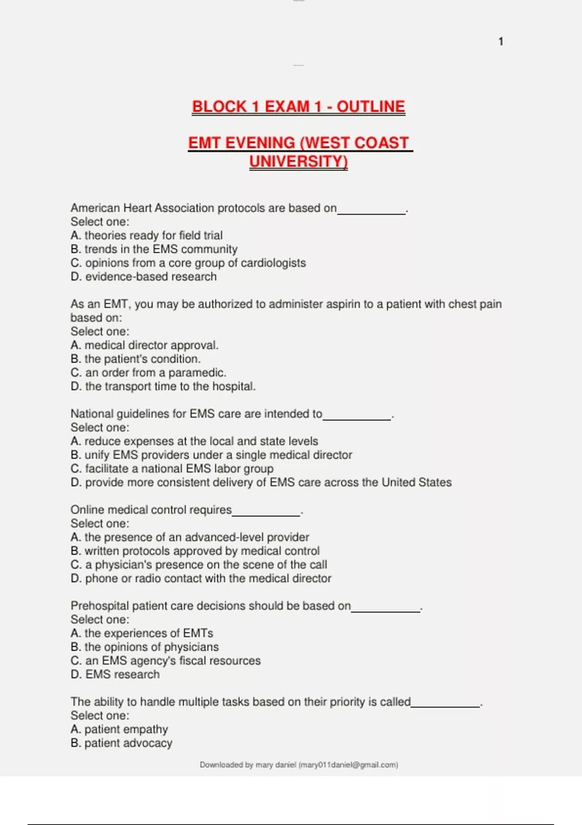 BLOCK 1 EXAM 1 - OUTLINE EMT EVENING (WEST COAST UNIVERSITY)