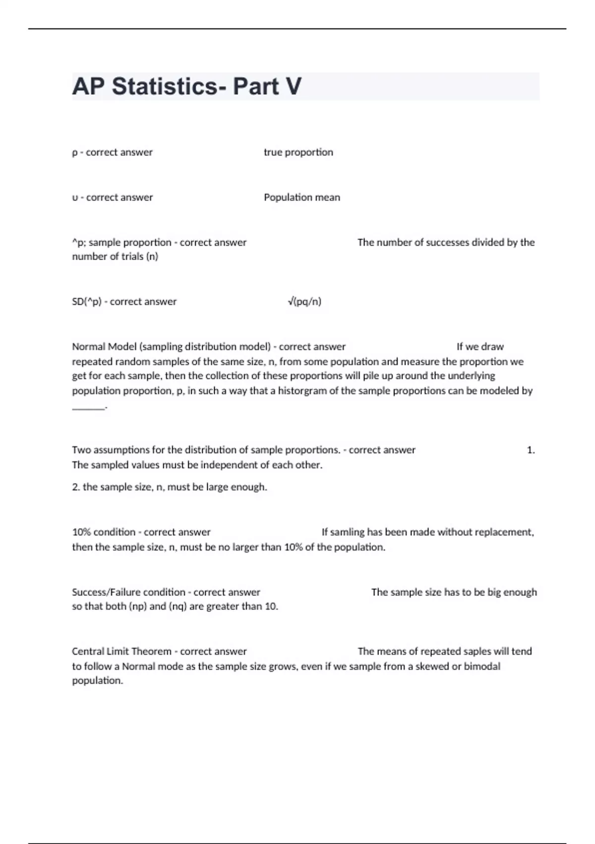 ρ - correct answer true proportion υ - correct answer Population mean ^p; sample proportion - correct answer The number of successes divided by the number of trials (n) SD(^p) - correct answer √(pq/n) Normal Model (sampling distribution model) - correct answer If we draw repeated random samples of the same size, n, from some population and measure the proportion we get for each sample, then the collection of these proportions will pile up around the underlying population proportion, p, in such a way that a historgram of the sample proportions can be modeled by ______. Two assumptions for the distribution of sample proportions. - correct answer 1. The sampled values must be independent of each other. 2. the sample size, n, must be large enough. 10% condition - correct answer If samling has been made without replacement, then the sample size, n, must be no larger than 10% of the population. Success/Failure condition - correct answer The sample size has to be big enough so that both (np) and (nq) are greater than 10. Central Limit Theorem - correct answer The means of repeated saples will tend to follow a Normal mode as the sample size grows, even if we sample from a skewed or bimodal population. Standard deviation parameter of the sampling distribution model for the mean, ȳ, SD(ȳ). - correct answer Only goes down by the square root of the sample size. (ϑ/√n) Random Sampling condtion - correct answer The values must be sampld randomly or the consept of a sampling distribution makes no sense. Independence Assumption (10% condition) - correct answer The sampled values must be mutually independent. There's no way to check in general whether the observations are independent. However, when the sample is drawn without replacement (usually the cse), you shuld check the _____-sampe size, n, is no moe than 10% of the population. stadard error - correct answer whenever we estimate the standard deviation of a sampling distribution using statistics found from the sata. for ^p: =√(p)(q)/n. for ȳ: = s/√n. statistic - correct answer Random quantity; one instance something that happened for a particular random sample. sampling distribution model - correct answer Different random samples give different values for a statistic. The sampling distribution model shows the behavior of the statistic over all the possible values. sampling distribution model for a proportion - correct answer If assumptions of independence and random sampling are met, and we expect at least 10 successes and 10 failures, then the sampling distribution of a proportion is modeled by a Normal model with a mean equal to the true proportion value, p, and a standard deviation equal to √(pq/n) sapling distribution model for a mean - correct answer If the assumptions of independence and random sampling are met, and the sample size is large enough, the sampling distribution of the sample mean is modeled by a Normal model with a mean equal to the population mean, υ, and standard deciation equal to ϑ/√n. variance - correct answer The ______ of the sum or difference of two indep