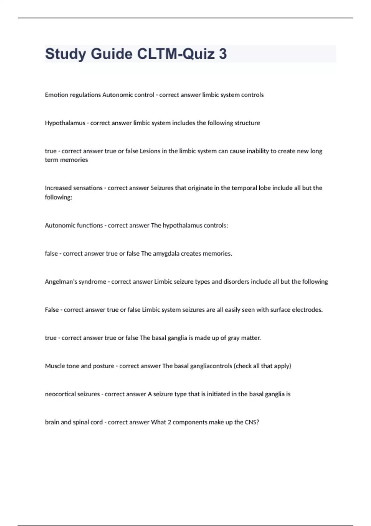 Study Guide CLTM-Quiz 3 Questions with complete solution 2024 Emotion regulations Autonomic control - correct answer limbic system controls Hypothalamus - correct answer limbic system includes the following structure true - correct answer true or false Lesions in the limbic system can cause inability to create new long term memories Increased sensations - correct answer Seizures that originate in the temporal lobe include all but the following: Autonomic functions - correct answer The hypothalamus controls: false - correct answer true or false The amygdala creates memories. Angelman's syndrome - correct answer Limbic seizure types and disorders include all but the following False - correct answer true or false Limbic system seizures are all easily seen with surface electrodes. true - correct answer true or false The basal ganglia is made up of gray matter. Muscle tone and posture - correct answer The basal gangliacontrols (check all that apply) neocortical seizures - correct answer A seizure type that is initiated in the basal ganglia is