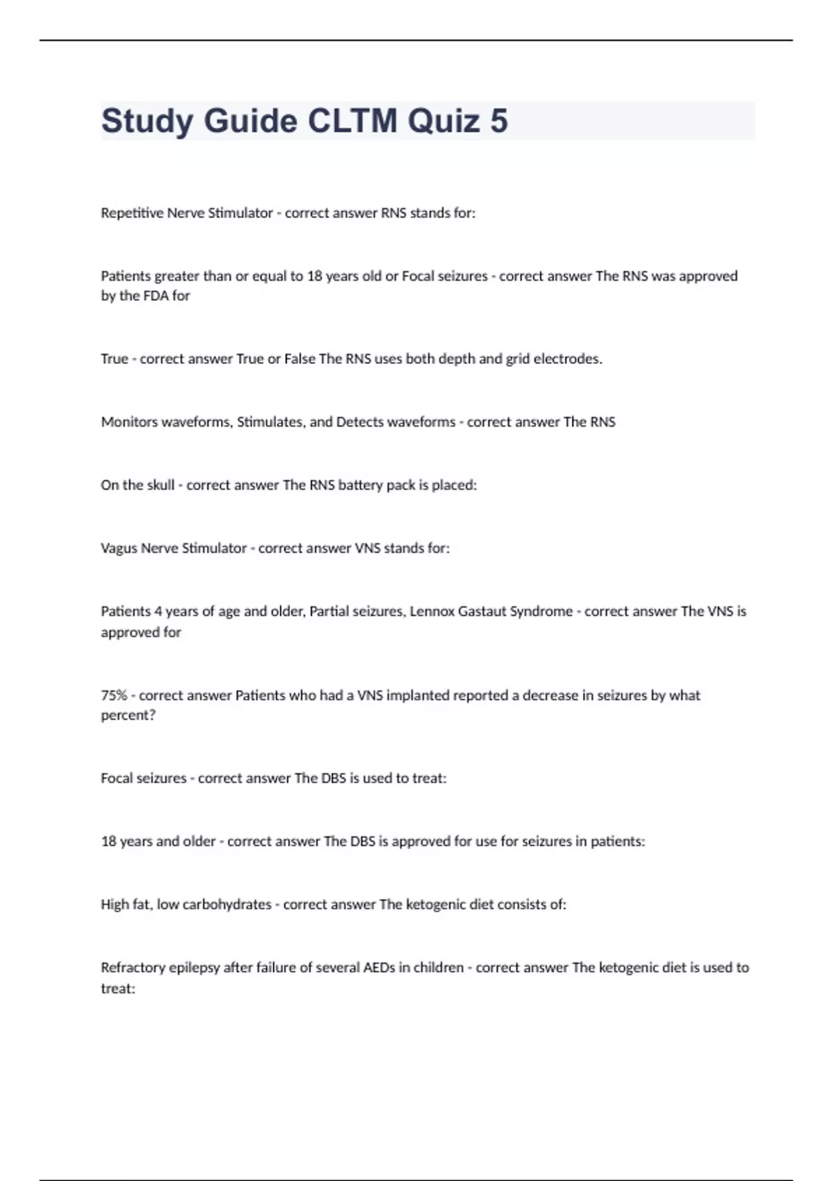 Study Guide CLTM Quiz 5 Question and answers 100% correct 2024 Repetitive Nerve Stimulator - correct answer RNS stands for: Patients greater than or equal to 18 years old or Focal seizures - correct answer The RNS was approved by the FDA for True - correct answer True or False The RNS uses both depth and grid electrodes. Monitors waveforms, Stimulates, and Detects waveforms - correct answer The RNS On the skull - correct answer The RNS battery pack is placed: Vagus Nerve Stimulator - correct answer VNS stands for: Patients 4 years of age and older, Partial seizures, Lennox Gastaut Syndrome - correct answer The VNS is approved for 75% - correct answer Patients who had a VNS implanted reported a decrease in seizures by what percent? Focal seizures - correct answer The DBS is used to treat: 18 years and older - correct answer The DBS is approved for use for seizures in patients: High fat, low carbohydrates - correct answer The ketogenic diet consists of: Refractory epilepsy after f