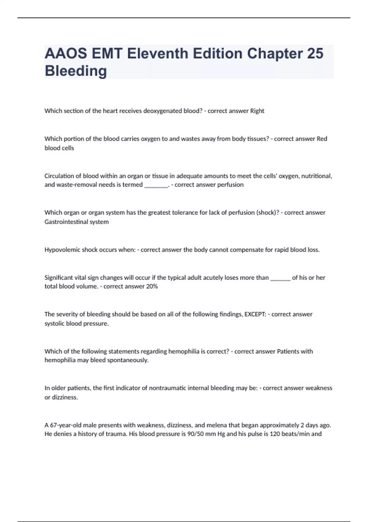 AAOS EMT Eleventh Edition Chapter 25 Bleeding Advanced Test 2024. Which section of the heart receives deoxygenated blood? - correct answer Right Which portion of the blood carries oxygen to and wastes away from body tissues? - correct answer Red blood cells Circulation of blood within an organ or tissue in adequate amounts to meet the cells' oxygen, nutritional, and waste-removal needs is termed _______. - correct answer perfusion Which organ or organ system has the greatest tolerance for lack of perfusion (shock)? - correct answer Gastrointestinal system Hypovolemic shock occurs when: - correct answer the body cannot compensate for rapid blood loss. Significant vital sign changes will occur if the typical adult acutely loses more than ______ of his or her total blood volume. - correct answer 20% The severity of bleeding should be based on all of the following findings, EXCEPT: - correct answer systolic blood pressure. Which of the following statements regarding hemophilia is correct? - correct answer Patients with hemophilia may bleed spontaneously. In older patients, the first indicator of nontraumatic internal bleeding may be: - correct answer weakness or dizziness. A 67-year-old male presents with weakness, dizziness, and melena that began approximately 2 days ago. He denies a history of trauma. His blood pressure is 90/50 mm Hg and his pulse is 120 beats/min and