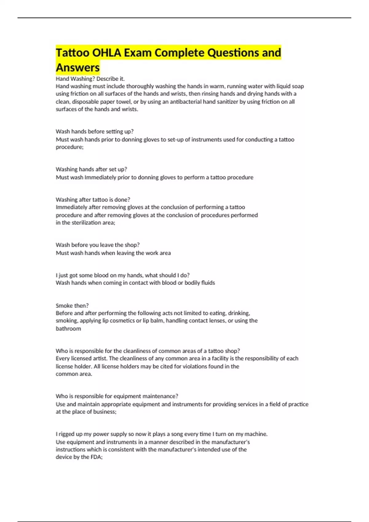 Tattoo OHLA Exam Complete Questions and Answers Hand Washing? Describe it. Hand washing must include thoroughly washing the hands in warm, running water with liquid soap using friction on all surfaces of the hands and wrists, then rinsing hands and drying hands with a clean, disposable paper towel, or by using an antibacterial hand sanitizer by using friction on all surfaces of the hands and wrists. Wash hands before setting up? Must wash hands prior to donning gloves to set-up of instruments used for conducting a tattoo procedure; Washing hands after set up? Must wash Immediately prior to donning gloves to perform a tattoo procedure Washing after tattoo is done? Immediately after removing gloves at the conclusion of performing a tattoo procedure and after removing gloves at the conclusion of procedures performed in the sterilization area; Wash before you leave the shop? Must wash hands when leaving the work area I just got some blood on my hands, what should I do? Wash hands when coming in contact with blood or bodily fluids Smoke then? Before and after performing the following acts not limited to eating, drinking, smoking, applying lip cosmetics or lip balm, handling contact lenses, or using the bathroom Who is responsible for the cleanliness of common areas of a tattoo shop? Every licensed artist. The cleanliness of any common area in a facility is the responsibility of each license holder. All license holders may be cited for violations found in the common area. Who is responsible for equipment maintenance? Use and maintain appropriate equipment and instruments for providing services in a field of practice at the place of business; I rigged up my power supply so now it plays a song every time I turn on my machine. Use equipment and instruments in a manner described in the manufacturer's instructions which is consistent with the manufacturer's intended use of the device by the FDA;