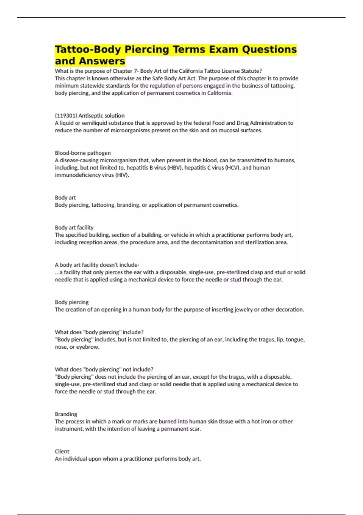 Tattoo-Body Piercing Terms Exam Questions and Answers What is the purpose of Chapter 7- Body Art of the California Tattoo License Statute? This chapter is known otherwise as the Safe Body Art Act. The purpose of this chapter is to provide minimum statewide standards for the regulation of persons engaged in the business of tattooing, body piercing, and the application of permanent cosmetics in California. (119301) Antiseptic solution A liquid or semiliquid substance that is approved by the federal Food and Drug Administration to reduce the number of microorganisms present on the skin and on mucosal surfaces. Blood-borne pathogen A disease-causing microorganism that, when present in the blood, can be transmitted to humans, including, but not limited to, hepatitis B virus (HBV), hepatitis C virus (HCV), and human immunodeficiency virus (HIV). Body art Body piercing, tattooing, branding, or application of permanent cosmetics. Body art facility The specified building, section of a building, or vehicle in which a practitioner performs body art, including reception areas, the procedure area, and the decontamination and sterilization area. A body art facility doesn't include- ...a facility that only pierces the ear with a disposable, single-use, pre-sterilized clasp and stud or solid needle that is applied using a mechanical device to force the needle or stud through the ear. Body piercing The creation of an opening in a human body for the purpose of inserting jewelry or other decoration. What does "body piercing" include? "Body piercing" includes, but is not limited to, the piercing of an ear, including the tragus, lip, tongue, nose, or eyebrow. What does "body piercing" not include? "Body piercing" does not include the piercing of an ear, except for the tragus, with a disposable, single-use, pre-sterilized stud and clasp or solid needle that is applied using a mechanical device to force the needle or stud through the ear. Branding The process in which a mark or marks are burned into human skin tissue with a hot iron or other instrument, with the intention of leaving a permanent scar. Client An individual upon whom a practitioner performs body art.