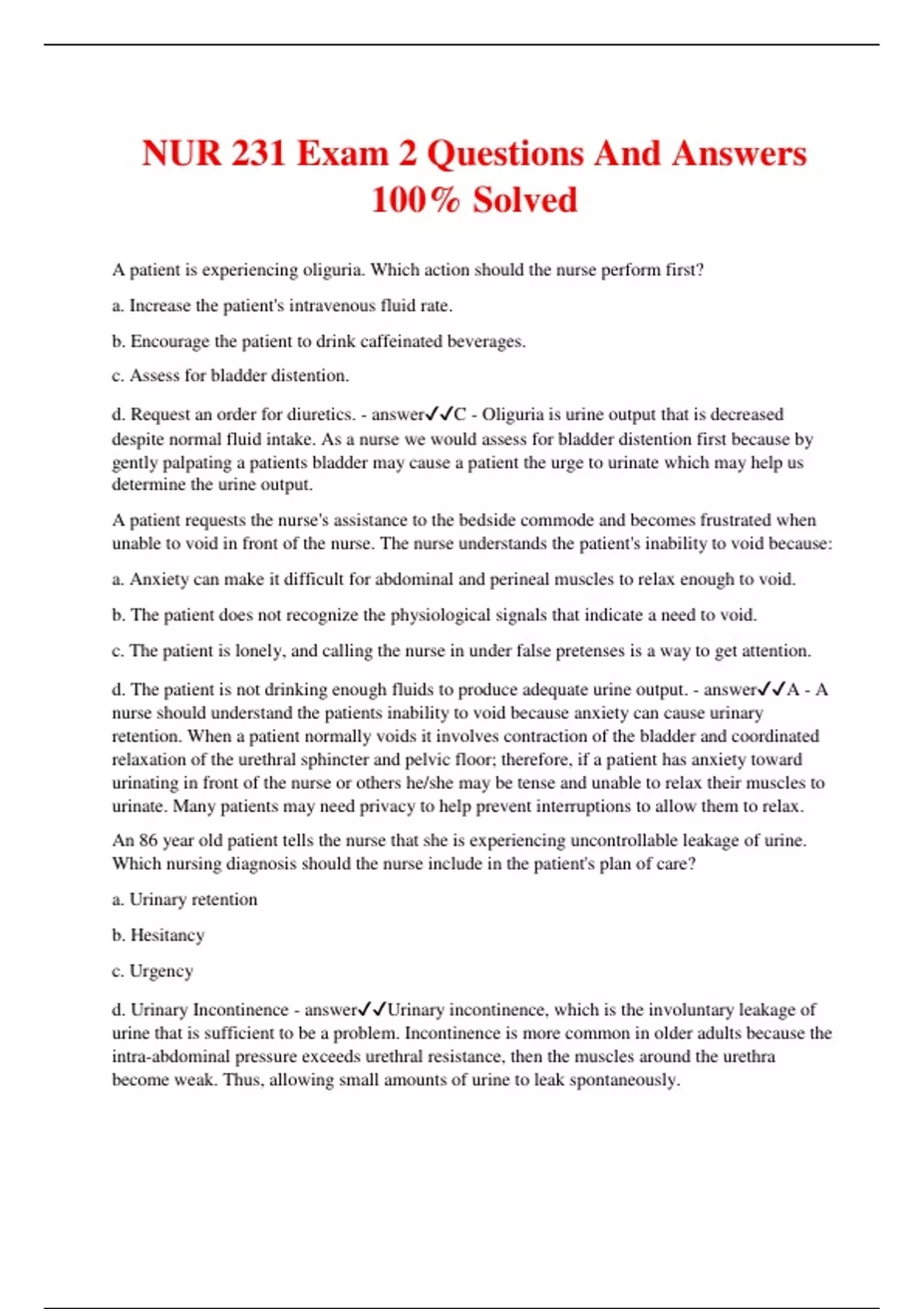 NUR 231 Exam 2 Questions And Answers 100% Solved A patient is experiencing oliguria. Which action should the nurse perform first? a. Increase the patient's intravenous fluid rate. b. Encourage the patient to drink caffeinated beverages. c. Assess for bladder distention. d. Request an order for diuretics. - answerC - Oliguria is urine output that is decreased despite normal fluid intake. As a nurse we would assess for bladder distention first because by gently palpating a patients bladder may cause a patient the urge to urinate which may help us determine the urine output. A patient requests the nurse's assistance to the bedside commode and becomes frustrated when unable to void in front of the nurse. The nurse understands the patient's inability to void because: a. Anxiety can make it difficult for abdominal and perineal muscles to relax enough to void. b. The patient does not recognize the physiological signals that indicate a need to void. c. The patient is lonely, and calling the nurse in under false pretenses is a way to get attention. d. The patient is not drinking enough fluids to produce adequate urine output. - answerA - A nurse should understand the patients inability to void because anxiety can cause urinary retention. When a patient normally voids it involves contraction of the bladder and coordinated relaxation of the urethral sphincter and pelvic floor; therefore, if a patient has anxiety toward urinating in front of the nurse or others he/she may be tense and unable to relax their muscles to urinate. Many patients may need privacy to help prevent interruptions to allow them to relax. An 86 year old patient tells the nurse that she is experiencing uncontrollable leakage of urine. Which nursing diagnosis should the nurse include in the patient's plan of care? a. Urinary retention b. Hesitancy c. Urgency d. Urinary Incontinence - answerUrinary incontinence, which is the involuntary leakage of urine that is sufficient to be a problem. Incontinence is more common in older adults because the intra-abdominal pressure exceeds urethral resistance, then the muscles around the urethra become weak. Thus, allowing small amounts of urine to leak spontaneously. The patient expresses difficulty voiding and the constant urge to urinate. The nurse should follow up by: a. Using a bladder scanner to determine if there is post-void residual. b. Telling the patient to run water when voiding. c. Instructing the patient to perform Kegel exercises. d. Checking the patient's vital signs. - answerA - The bladder scanner helps assess for post- void residual (PVR). Residual urine or post-void residual occurs if a patient has urinary retention or cannot empty the bladder completely. This measurement would help the nurse see if the patient has urine left in the bladder after voiding and/or if there is another issue with voiding. A normal void the bladder should empty completely A patient asks about treatment for urge incontinence. The nurse's best response is to advise the patient to: (Choose all that apply.) a. perform pelvic floor exercises. b. Bladder retraining c. avoid voiding frequently. d. Wear absorbent products. - answerA, B, D - Improve the strength of pelvic floor muscles and consist of repetitive contractions of muscle groups. The exercises are noninvasive and carry a low risk of adverse effects. In bladder training the goal is to reduce the voiding frequency and perhaps the bladder capacity. The retraining will hopefully help restore a normal pattern of voiding by teaching patients to keep the patient continent.Wearing absorbent pads promotes the comfort of a patient. An incontinent patient gains comfort from having clean, dry clothing To obtain a clean-catch voided urine specimen for a female patient, the nurse should teach the patient to: (Choose all that apply.) a. Cleanse the urethral meatus from back to front. b. Initiate the first part of the urine stream directly into the collection cup. c. Hold the labia apart while voiding into the specimen cup. d. Transport to laboratory within 15 to 30 minutes or refrigerate immediately. - answerC, D - If labia closes then the specimen is contaminated and becomes unsterile for laboratory purposes. If the patient fails to hold the labia open then the procedure may have to perform again including the perennial care. Because bacteria grow quickly in urine not received by laboratory within 30 minutes should be refrigerated