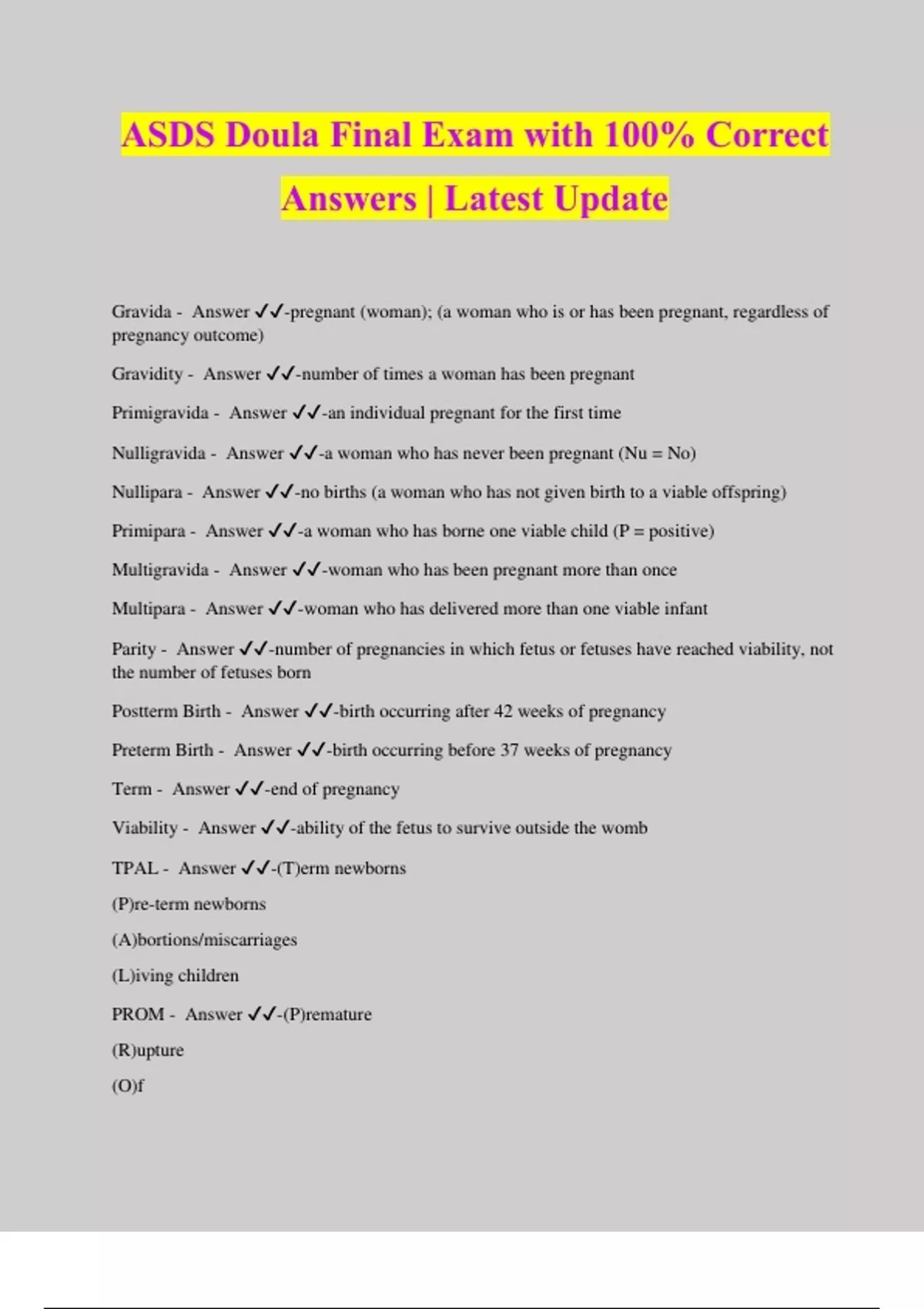 ASDS Doula Final Exam with 100% Correct Answers | Latest Update Gravida - Answer ️️ -pregnant (woman); (a woman who is or has been pregnant, regardless of pregnancy outcome) Gravidity - Answer ️️ -number of times a woman has been pregnant Primigravida - Answer ️️ -an individual pregnant for the first time Nulligravida - Answer ️️ -a woman who has never been pregnant (Nu = No) Nullipara - Answer ️️ -no births (a woman who has not given birth to a viable offspring) Primipara - Answer ️️ -a woman who has borne one viable child (P = positive) Multigravida - Answer ️️ -woman who has been pregnant more than once Multipara - Answer ️️ -woman who has delivered more than one viable infant Parity - Answer ️️ -number of pregnancies in which fetus or fetuses have reached viability, not the number of fetuses born Postterm Birth - Answer ️️ -birth occurring after 42 weeks of pregnancy Preterm Birth - Answer ️️ -birth occurring before 37 weeks of pregnancy Term - Answer ️️ -end of pregnancy Viability - Answer ️️ -ability of the fetus to survive outside the womb TPAL - Answer ️️ -(T)erm newborns (P)re-term newborns (A)bortions/miscarriages (L)iving children PROM - Answer ️️ -(P)remature (R)upture (O)f (M)embranes What are human rights? - Answer ️️ -Rights that every human is entitled to. Such as civic, political, social, economic, and cultural rights. *They cannot be granted or taken away. They must all be respected.* Reproductive Justice - Answer ️️ -about access not just choice, not just about abortion. there is no choice when there is no access. - RJ is about access to STI prevention/care, contraception, sex ed (comprehensive), alternative birth options, safe homes, etc. Intersectionality - Answer ️️ -- Overlapping of social categories such as race, class, gender as they apply to a given individual or group. - Creates interdependent systems of discrimination/disadvantage. *Coined by Kimberlé Crenshaw (1989) No Mas Bebes - Answer ️️ -Madrigal v. Quilligan (1981) : the prosecution alleged that a group Mexican-American women had been been sterilized either through coercion or without informed consent (patients were signing forms in English but only spoke Spanish.) The judge sided with the doctors but after the case, form were made available in multiple language. Black Mamas Matter - Answer ️️ -Black Mamas Matter is an alliance co-founded by SisterSong Reproductive Justice Collective and the Center for Reproductive Rights in 2015. As a collective, it aims
