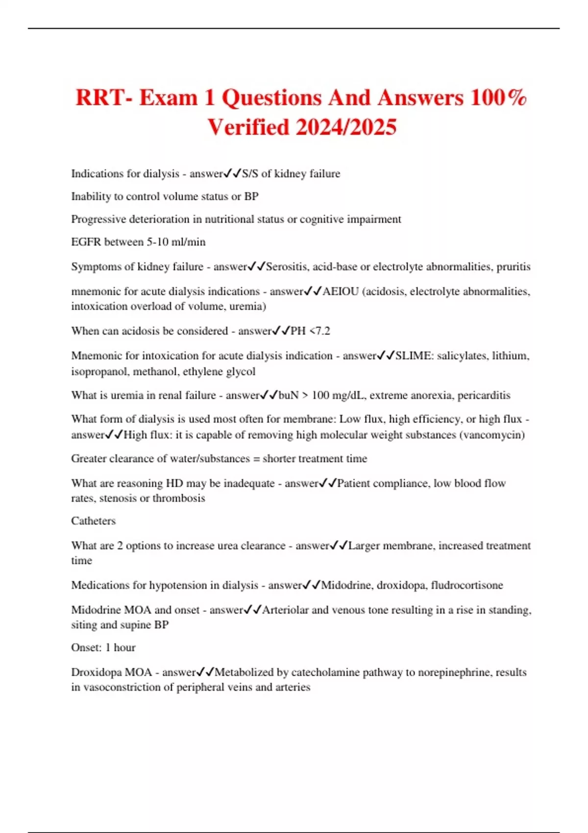 RRT- Exam 1 Questions And Answers 100% Verified 2024/2025 Indications for dialysis - answerS/S of kidney failure Inability to control volume status or BP Progressive deterioration in nutritional status or cognitive impairment EGFR between 5-10 ml/min Symptoms of kidney failure - answerSerositis, acid-base or electrolyte abnormalities, pruritis mnemonic for acute dialysis indications - answerAEIOU (acidosis, electrolyte abnormalities, intoxication overload of volume, uremia) When can acidosis be considered - answerPH <7.2 Mnemonic for intoxication for acute dialysis indication - answerSLIME: salicylates, lithium, isopropanol, methanol, ethylene glycol What is uremia in renal failure - answerbuN > 100 mg/dL, extreme anorexia, pericarditis What form of dialysis is used most often for membrane: Low flux, high efficiency, or high flux - answerHigh flux: it is capable of removing high molecular weight substances (vancomycin) Greater clearance of water/substances = shorter treatment time What are reasoning HD may be inadequate - answerPatient compliance, low blood flow rates, stenosis or thrombosis Catheters What are 2 options to increase urea clearance - answerLarger membrane, increased treatment time Medications for hypotension in dialysis - answerMidodrine, droxidopa, fludrocortisone Midodrine MOA and onset - answerArteriolar and venous tone resulting in a rise in standing, siting and supine BP Onset: 1 hour Droxidopa MOA - answerMetabolized by catecholamine pathway to norepinephrine, results in vasoconstriction of peripheral veins and arteries