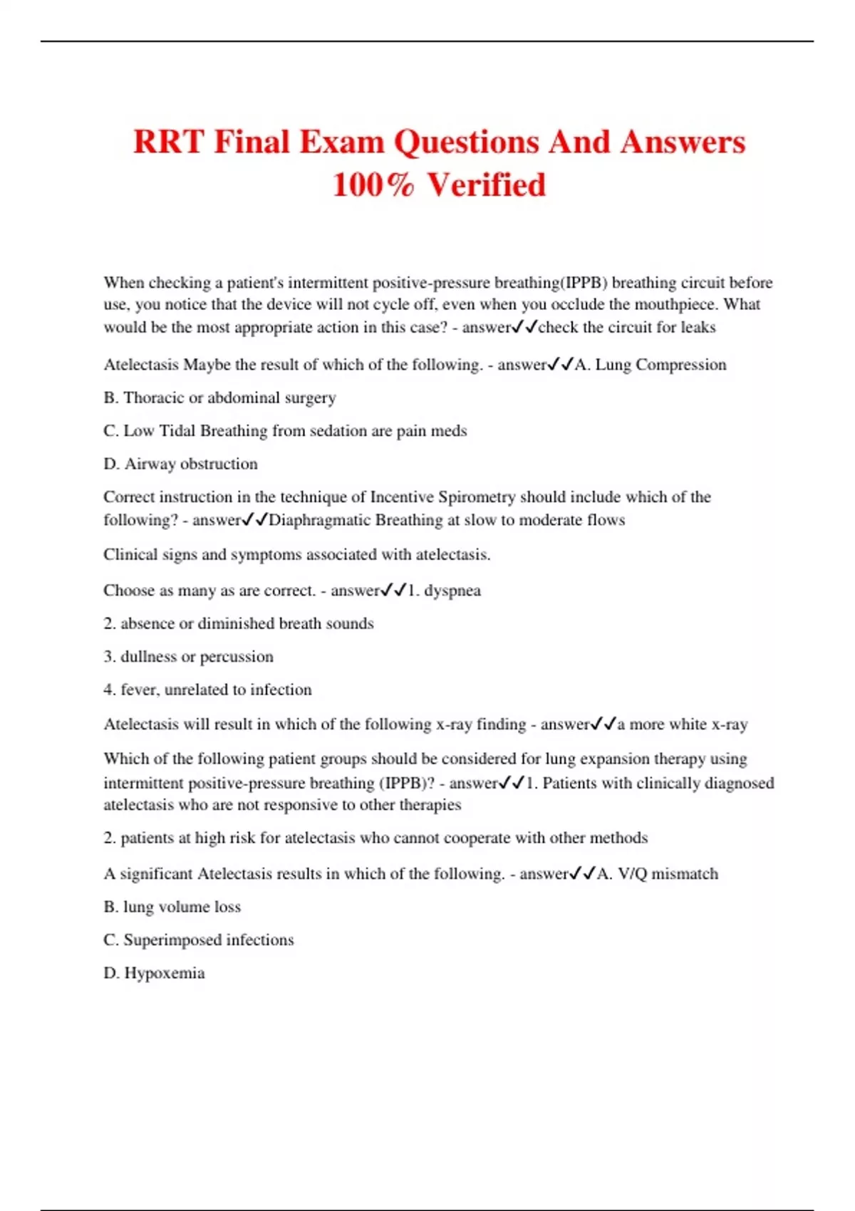 RRT Final Exam Questions And Answers 100% Verified When checking a patient's intermittent positive-pressure breathing(IPPB) breathing circuit before use, you notice that the device will not cycle off, even when you occlude the mouthpiece. What would be the most appropriate action in this case? - answercheck the circuit for leaks Atelectasis Maybe the result of which of the following. - answerA. Lung Compression B. Thoracic or abdominal surgery C. Low Tidal Breathing from sedation are pain meds D. Airway obstruction Correct instruction in the technique of Incentive Spirometry should include which of the following? - answerDiaphragmatic Breathing at slow to moderate flows Clinical signs and symptoms associated with atelectasis. Choose as many as are correct. - answer1. dyspnea 2. absence or diminished breath sounds 3. dullness or percussion 4. fever, unrelated to infection Atelectasis will result in which of the following x-ray finding - answera more white x-ray Which of the following patient groups should be considered for lung expansion therapy using intermittent positive-pressure breathing (IPPB)? - answer1. Patients with clinically diagnosed atelectasis who are not responsive to other therapies 2. patients at high risk for atelectasis who cannot cooperate with other methods A significant Atelectasis results in which of the following. - answerA. V/Q mismatch B. lung volume loss C. Superimposed infections D. Hypoxemia Successful application of Incentive Spirometry depends mainly on what? - answerthe effectiveness of patient teaching Which of the following is false about flow-oriented Incentive Spirometry devices? - answerThey have proved less effective than volumetric systems A significant typical absorption Atelectasis may result in a mediastinal shift: - answertowards the affected lung Methods used for lung expansion therapy include which of the following. I. Incentive Spirometry - IS therapy II. Aerogen vibrating mesh nebulizer III. CPAP - Continuous Positive Airway Pressure IV. PEP - Positive Expiratory Pressure - answerI. Incentive Spirometry - IS therapy III. CPAP - Continuous Positive Airway Pressure IV. PEP - Positive Expiratory Pressure Ideally, Incentive Spirometry should be performed how often, minimally? - answer10X per hour Treatment of atelectasis may include which of the following. Choose as many as are correct. - answera. mechanical insufflation-explaination b. intrapulmonary percussive ventilation c. deep breathing and assisted cough d. chest physiotherarpy e. intermittent positive pressure breathing A post-op patient receiving lung inflation therapy complains of dizziness and numbness around the mouth after therapy sessions. What is the most likely cause of these symptoms? - answerhyperventilation In teaching a patient to perform the sustained maximal inspiration (SMI) maneuver during IS, what would you say? - answerD."Exhale normally, then inhale as deeply as you can, then hold your breath for 5 to 10 seconds Compression atelectasis may results when fluid is in the pleural space collapsing the lung. True or False - answerTrue Lack of surfactant will result in atelectasis in newborns and premature infants. True or False - answerTrue A complete or partial collapse of the entire lung or area (lobe) of the lung Most correctly defines which of the following - answerAtelectasis Proper diaphragmatic breathing should do which of the following. A. increase the work of breathing B. increase oxygen consumption C. decrease the work of breathing - answerC. decrease the work of breathing During inhalation contraction of the diaphragm causes: A. pressure in the chest to increase B. the abdomen to move out C. pressure in the chest to decrease D. the abdomen to move in - answerB. the abdomen to move out C. pressure in the chest to decrease Proper diaphragmatic breathing training should include which of the following steps. 1. Breathing in slowly through the nose. 2. Breathing in quickly through the mouth 3. Using inspiratory accessory muscles. 4. Exhaling slowly through pursed lips. 5. Exhale in quickly with a loud cough sound - answer1&4 only Ideally, when should high-risk surgical patients be oriented to Incentive Spirometry - answerpreoperatively, before undergoing the surgical procedure Persistent breathing at small tidal volumes can result in which of the following? - answercompression atelectasis Which of the following patient categories are at high risk for developing atelectasis? - answerI. Those who are heavily sedated II. Those with abdominal or thoracic pain III. Those with neuromuscular disorder