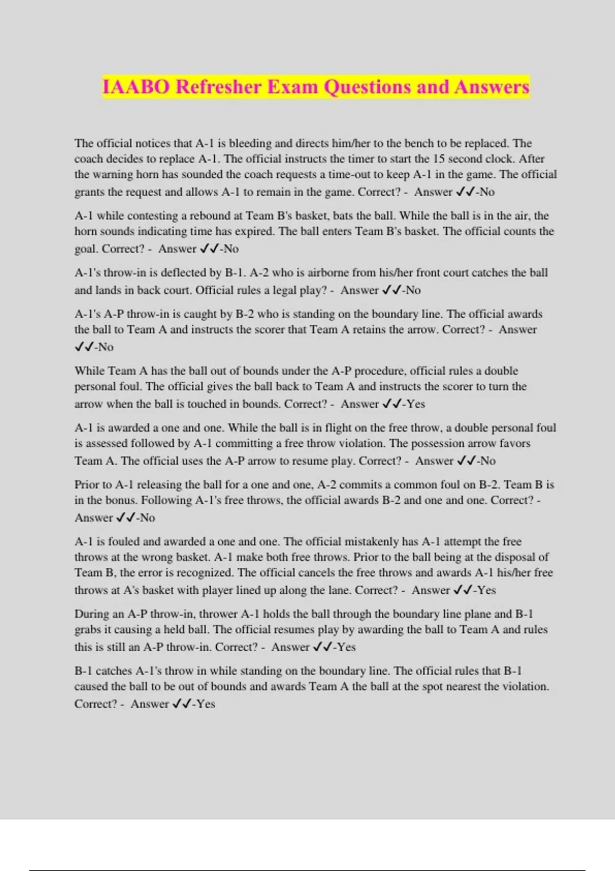 IAABO Refresher Exam Questions and Answers The official notices that A-1 is bleeding and directs him/her to the bench to be replaced. The coach decides to replace A-1. The official instructs the timer to start the 15 second clock. After the warning horn has sounded the coach requests a time-out to keep A-1 in the game. The official grants the request and allows A-1 to remain in the game. Correct? - Answer ️️ -No A-1 while contesting a rebound at Team B's basket, bats the ball. While the ball is in the air, the horn sounds indicating time has expired. The ball enters Team B's basket. The official counts the goal. Correct? - Answer ️️ -No A-1's throw-in is deflected by B-1. A-2 who is airborne from his/her front court catches the ball and lands in back court. Official rules a legal play? - Answer ️️ -No A-1's A-P throw-in is caught by B-2 who is standing on the boundary line. The official awards the ball to Team A and instructs the scorer that Team A retains the arrow. Correct? - Answer ️️ -No While Team A has the ball out of bounds under the A-P procedure, official rules a double personal foul. The official gives the ball back to Team A and instructs the scorer to turn the arrow when the ball is touched in bounds. Correct? - Answer ️️ -Yes A-1 is awarded a one and one. While the ball is in flight on the free throw, a double personal foul is assessed followed by A-1 committing a free throw violation. The possession arrow favors Team A. The official uses the A-P arrow to resume play. Correct? - Answer ️️ -No Prior to A-1 releasing the ball for a one and one, A-2 commits a common foul on B-2. Team B is in the bonus. Following A-1's free throws, the official awards B-2 and one and one. Correct? - Answer ️️ -No A-1 is fouled and awarded a one and one. The official mistakenly has A-1 attempt the free throws at the wrong basket. A-1 make both free throws. Prior to the ball being at the disposal of Team B, the error is recognized. The official cancels the free throws and awards A-1 his/her free throws at A's basket with player lined up along the lane. Correct? - Answer ️️ -Yes During an A-P throw-in, thrower A-1 holds the ball through the boundary line plane and B-1 grabs it causing a held ball. The official resumes play by awarding the ball to Team A and rules this is still an A-P throw-in. Correct? - Answer ️️ -Yes