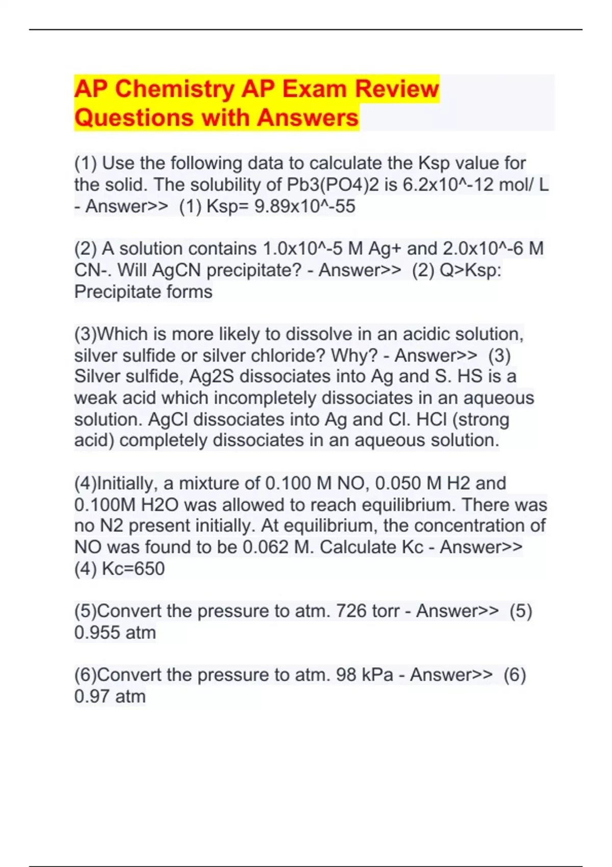 (1) Use the following data to calculate the Ksp value for the solid. The solubility of Pb3(PO4)2 is 6.2x10^-12 mol/ L - Answer>> (1) Ksp= 9.89x10^-55