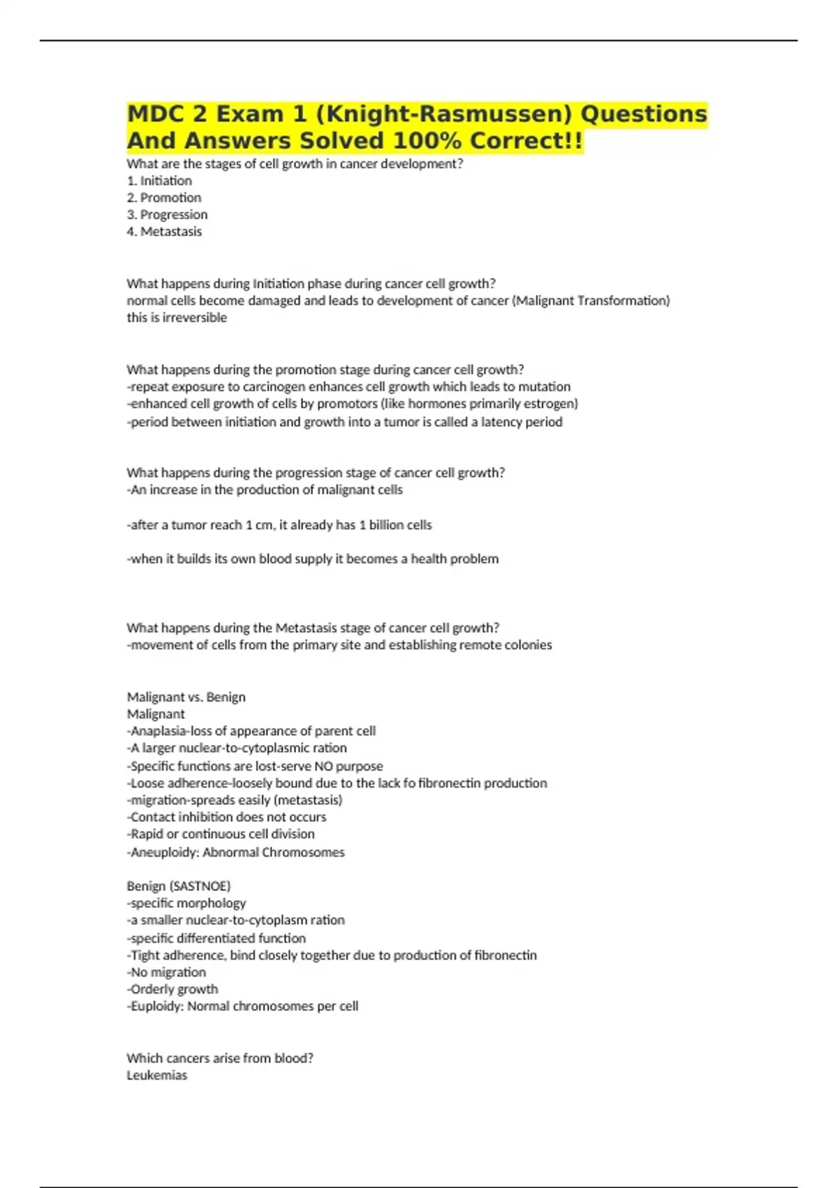 MDC 2 Exam 1 (Knight-Rasmussen) Questions And Answers Solved 100% Correct!! What are the stages of cell growth in cancer development? 1. Initiation 2. Promotion 3. Progression 4. Metastasis What happens during Initiation phase during cancer cell growth? normal cells become damaged and leads to development of cancer (Malignant Transformation) this is irreversible What happens during the promotion stage during cancer cell growth? -repeat exposure to carcinogen enhances cell growth which leads to mutation -enhanced cell growth of cells by promotors (like hormones primarily estrogen) -period between initiation and growth into a tumor is called a latency period What happens during the progression stage of cancer cell growth? -An increase in the production of malignant cells -after a tumor reach 1 cm, it already has 1 billion cells -when it builds its own blood supply it becomes a health problem What happens during the Metastasis stage of cancer cell growth? -movement of cells from the primary site and establishing remote colonies Malignant vs. Benign Malignant -Anaplasia-loss of appearance of parent cell -A larger nuclear-to-cytoplasmic ration -Specific functions are lost-serve NO purpose -Loose adherence-loosely bound due to the lack fo fibronectin production -migration-spreads easily (metastasis) -Contact inhibition does not occurs -Rapid or continuous cell division -Aneuploidy: Abnormal Chromosomes Benign (SASTNOE) -specific morphology -a smaller nuclear-to-cytoplasm ration -specific differentiated function -Tight adherence, bind closely together due to production of fibronectin -No migration -Orderly growth -Euploidy: Normal chromosomes per cell Which cancers arise from blood? Leukemias Which cancers affect the lymph? Lymphomas Which cancers originate in the epithelial cells and are likely to metastasize? Carcinomas Which cancers originate in the soft tissues like bone, muscles, blood vessels, and connecting tissues? Sarcomas Signs & Symptoms of cancer C-change in bowel or bladder habits A-a sore that does not heal U-unusual bleeding or discharge T-Thickening or lump in breast/elsewhere I-indigestion or difficulty swallowing O-obvious change in wart or mole N-nagging cough or hoarseness Staging of Cancer The exact location of the tumor is designated by T, N, or M. T meaning tumor, N meaning lymph node involvement, and M equaling Metastasis Cancer Prevention healthy lifestyle, early detection, know your genetic risks If you have a PT who has a family hx of colon cancer, what would you recommend? colonoscopy (secondary prevention) primary prevention of cancer smoking cessation vaccinations removal of at-risk tissue use of sunscreen using PPE in workplace reducing alcohol modifying diet chemoprevention secondary prevention cancer screenings (mammogram, colonoscopy) genetic testing Risk factors of cancer -smoking -consuming carcinogens: flavorings, red meats, nitrites, diets low in fiber -poor immunity -radiation -hormone drugs -alcohol -improper sun protection -Age What is the single most important risk factor for cancer? Age PT teaching to prevent cancer -maintain a healthy lifestyle -reduce exposure to cancer-causing substances -have routine screenings -be compliant with medication -vaccinations -eat more cruciferous veggies: broccoli, cauliflower, brussels, cabbage -limit alcohol consumption to no more than one or two drinks per day -minimize red meat intake -increase Vitamins A & C intake Types of treatment for cancer Chemo Radiation Surgery Prophylactic Surgery removal of suspected cancerous tissue Ex: removing a benign polyp from the colon before it can develop Diagnostic Surgery Biopsy/removal of all or part of a suspected lesion for examination and testing to confirm or rule out a cancer dx Curative Surgery removes all cancer tissue Ex: lobectomy Palliative Surgery focuses on providing symptom relief and improving quality of life but is not curative