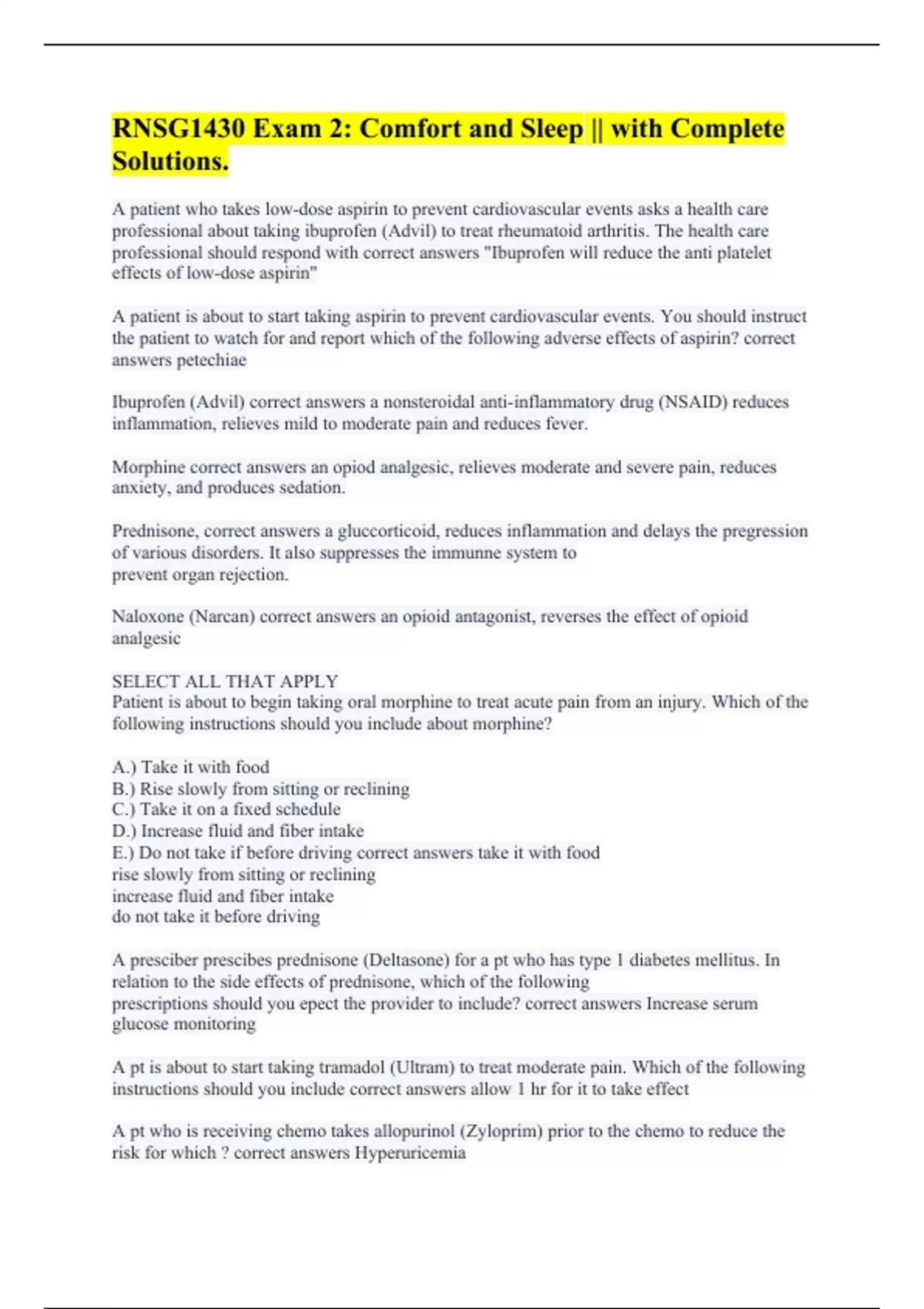 A patient who takes low-dose aspirin to prevent cardiovascular events asks a health care professional about taking ibuprofen (Advil) to treat rheumatoid arthritis. The health care professional should respond with correct answers "Ibuprofen will reduce the anti platelet effects of low-dose aspirin" A patient is about to start taking aspirin to prevent cardiovascular events. You should instruct the patient to watch for and report which of the following adverse effects of aspirin? correct answers petechiae Ibuprofen (Advil) correct answers a nonsteroidal anti-inflammatory drug (NSAID) reduces inflammation, relieves mild to moderate pain and reduces fever. Morphine correct answers an opiod analgesic, relieves moderate and severe pain, reduces anxiety, and produces sedation. Prednisone, correct answers a gluccorticoid, reduces inflammation and delays the pregression of various disorders. It also suppresses the immunne system to prevent organ rejection. Naloxone (Narcan) correct answers an opioid antagonist, reverses the effect of opioid analgesic SELECT ALL THAT APPLY Patient is about to begin taking oral morphine to treat acute pain from an injury. Which of the following instructions should you include about morphine? A.) Take it with food B.) Rise slowly from sitting or reclining C.) Take it on a fixed schedule D.) Increase fluid and fiber intake E.) Do not take if before driving correct answers take it with food rise slowly from sitting or reclining increase fluid and fiber intake do not take it before driving A presciber prescibes prednisone (Deltasone) for a pt who has type 1 diabetes mellitus. In relation to the side effects of prednisone, which of the following prescriptions should you epect the provider to include? correct answers Increase serum glucose monitoring A pt is about to start taking tramadol (Ultram) to treat moderate pain. Which of the following instructions should you include correct answers allow 1 hr for it to take effect A pt who is receiving chemo takes allopurinol (Zyloprim) prior to the chemo to reduce the risk for which ? correct answers Hyperuricemia