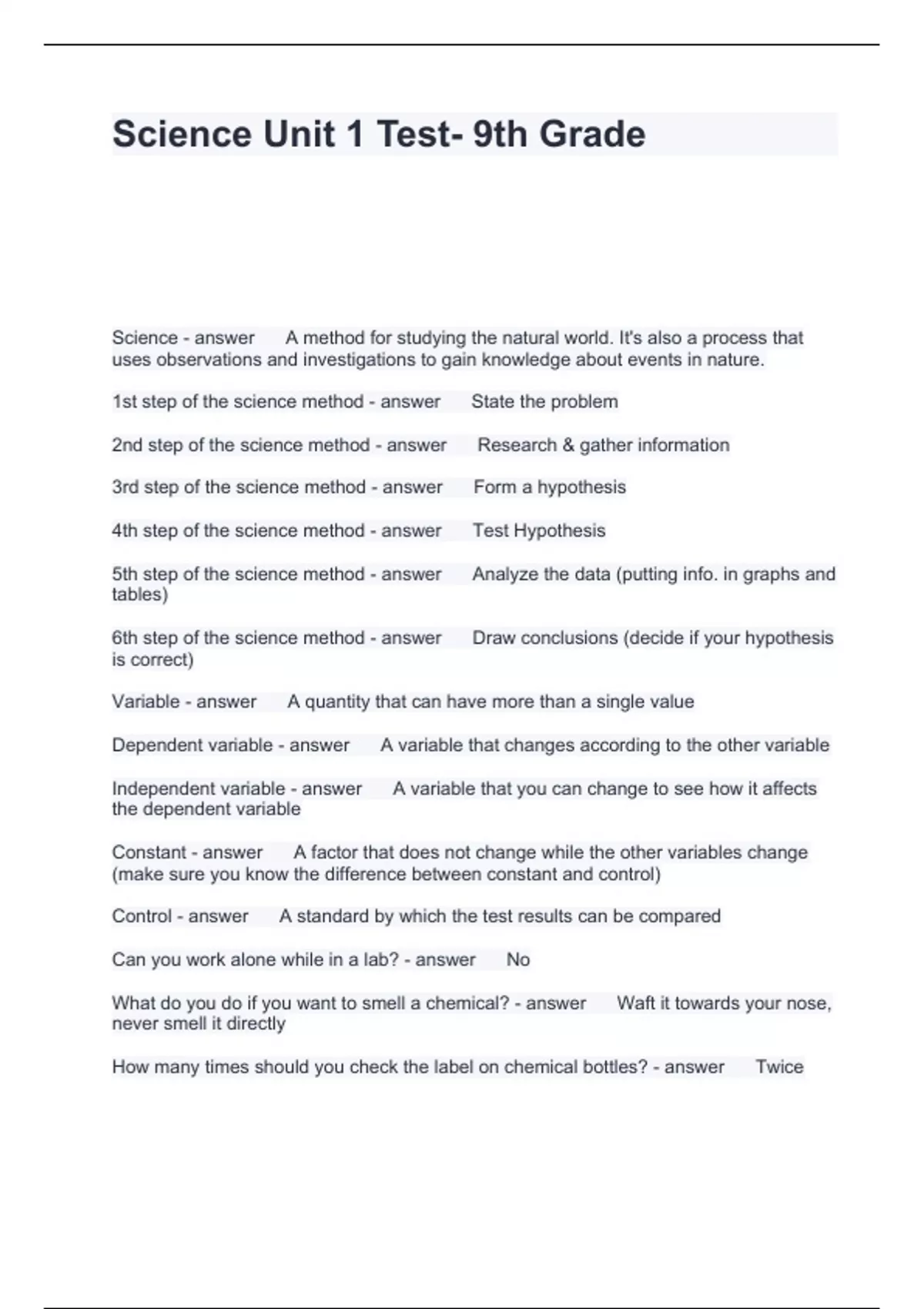 Science Unit 1 Test- 9th Grade Questions with correct Answers 2024