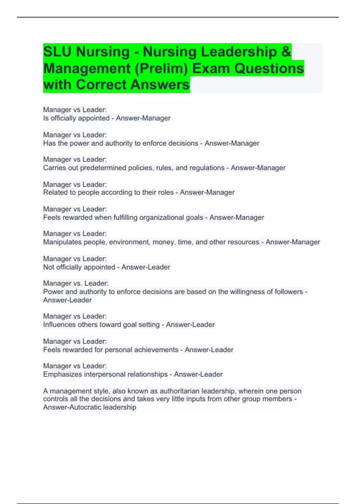 SLU Nursing - Nursing Leadership & Management (Prelim) Exam Questions with Correct Answers