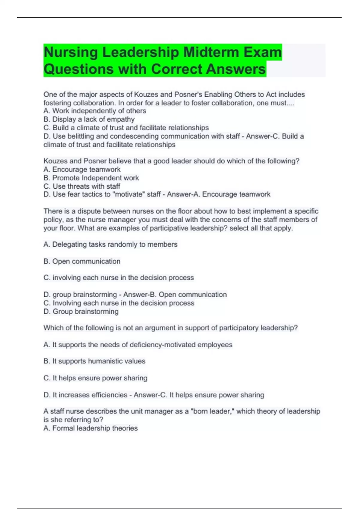 Nursing Leadership Midterm Exam Questions with Correct Answers Which type of leadership theories considers people able to learn to be a leader? A. Contingency theories B. Behavioral theories C. Trait theories D. Situational theories E. "Great Man" theories - Answer-B. Behavioral theories A student nurse is researching behavioral theories with his preceptor. The preceptor determines that the student nurse needs additional teaching when he states: A. "Behavioral theorists study what leaders do." B. "Behavioral theorists do not study inborn traits and capabilities." C. "According to behavioral theory, anyone can be made into a leader with training and determination." D. "It is easy to separate those with leadership potential from those who will never have the chance according to behavioral theory." - Answer-D. "It is easy to separate those with leadership potential from those who will never have the chance according to behavioral theory." According to the theory of humanistic and democratic values, in order to increase interpersonal competence, intergroup cooperation, and flexibility, the organization should: (select all that apply) A. Promote humanistic and democratic values B. Treat people as human beings C. Promote bureaucratic values D. Use clear, rational, and logical communication - Answer-A. Promote humanistic and democratic values B. Treat people as human beings D. Use clear, rational, and logical communication During leadership, the instructor is teaching nursing students about Argyris's theory of humanistic and democratic values. The first topic they discuss is about the different ways to increase organizational success in problem solving. Which of the following answers indicates that the nursing student has a need for further teaching? A. Encourage interpersonal competence B. Provide opportunities for employees to develop to their fullest potential C. Make work exciting and challenging D. Promote human relationships that are directive, and control oriented - Answer-D. Promote human relationships that are directive, and control oriented Which of the following statements describes a leader that is "modeling the way," oneof Kouzes and Posner's five practices from The Leadership Challenge? (Select all that apply) A. Clearly articulates his/her guiding principles.