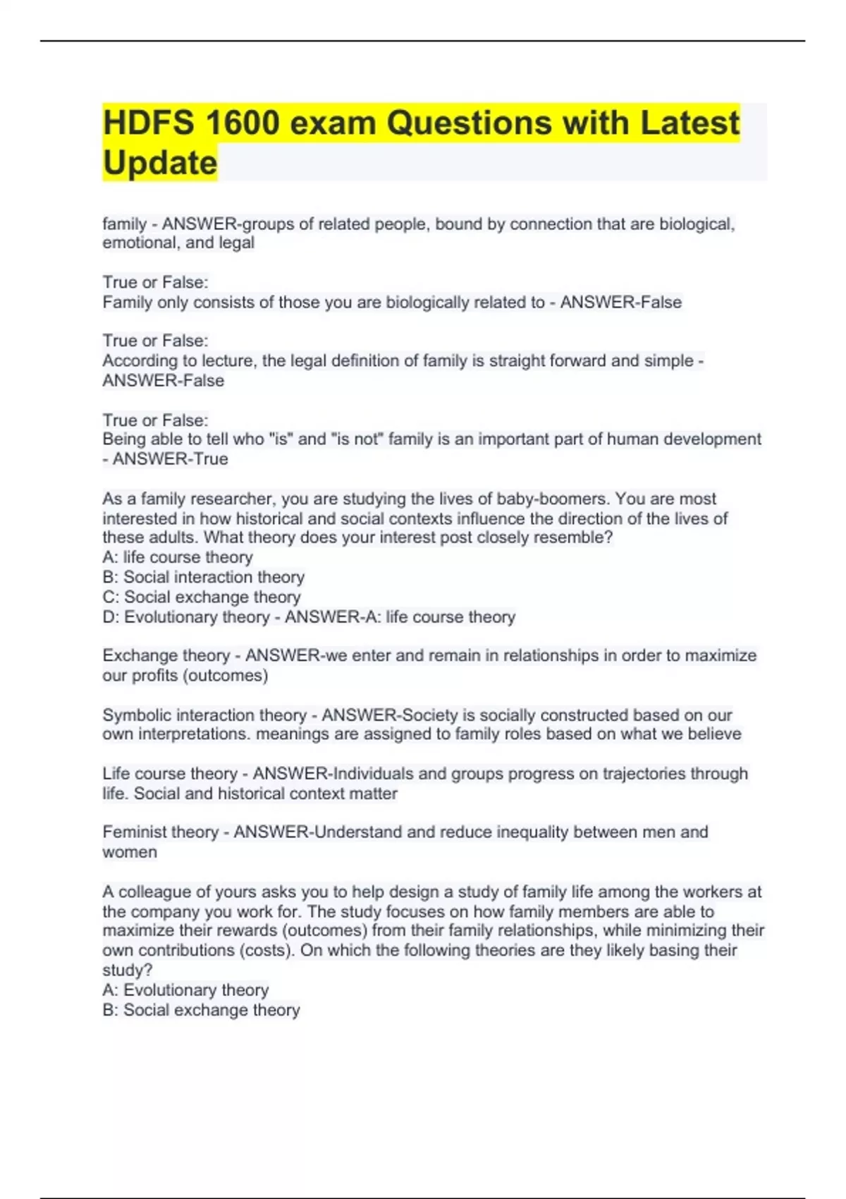 family - ANSWER-groups of related people, bound by connection that are biological, emotional, and legal True or False: Family only consists of those you are biologically related to - ANSWER-False True or False: According to lecture, the legal definition of family is straight forward and simple - ANSWER-False True or False: Being able to tell who "is" and "is not" family is an important part of human development - ANSWER-True As a family researcher, you are studying the lives of baby-boomers. You are most interested in how historical and social contexts influence the direction of the lives of these adults. What theory does your interest post closely resemble? A: life course theory B: Social interaction theory C: Social exchange theory D: Evolutionary theory - ANSWER-A: life course theory Exchange theory - ANSWER-we enter and remain in relationships in order to maximize our profits (outcomes) Symbolic interaction theory - ANSWER-Society is socially constructed based on our own interpretations. meanings are assigned to family roles based on what we believe Life course theory - ANSWER-Individuals and groups progress on trajectories through life. Social and historical context matter Feminist theory - ANSWER-Understand and reduce inequality between men and women A colleague of yours asks you to help design a study of family life among the workers at the company you work for. The study focuses on how family members are able to maximize their rewards (outcomes) from their family relationships, while minimizing their own contributions (costs). On which the following theories are they likely basing their study? A: Evolutionary theory B: Social exchange theory
