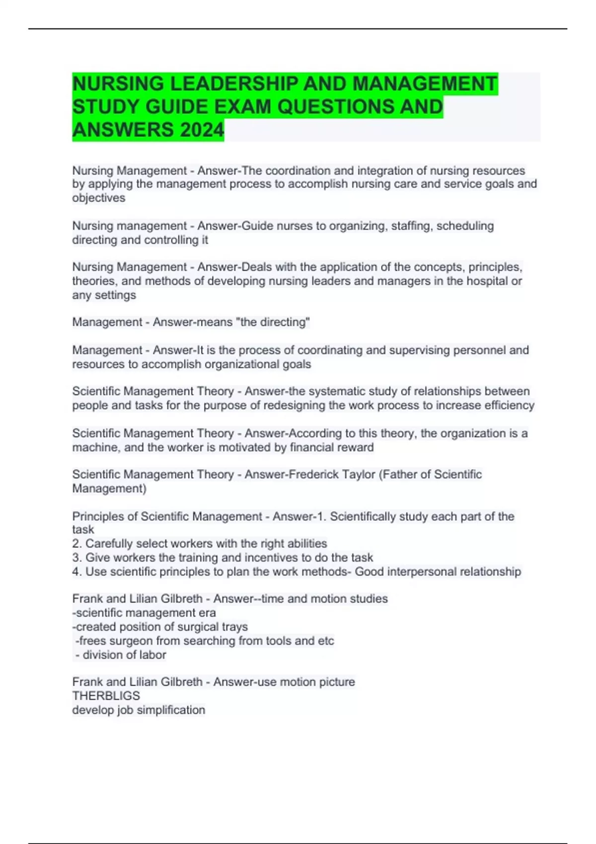 NURSING LEADERSHIP AND MANAGEMENT STUDY GUIDE EXAM QUESTIONS AND ANSWERS 2024