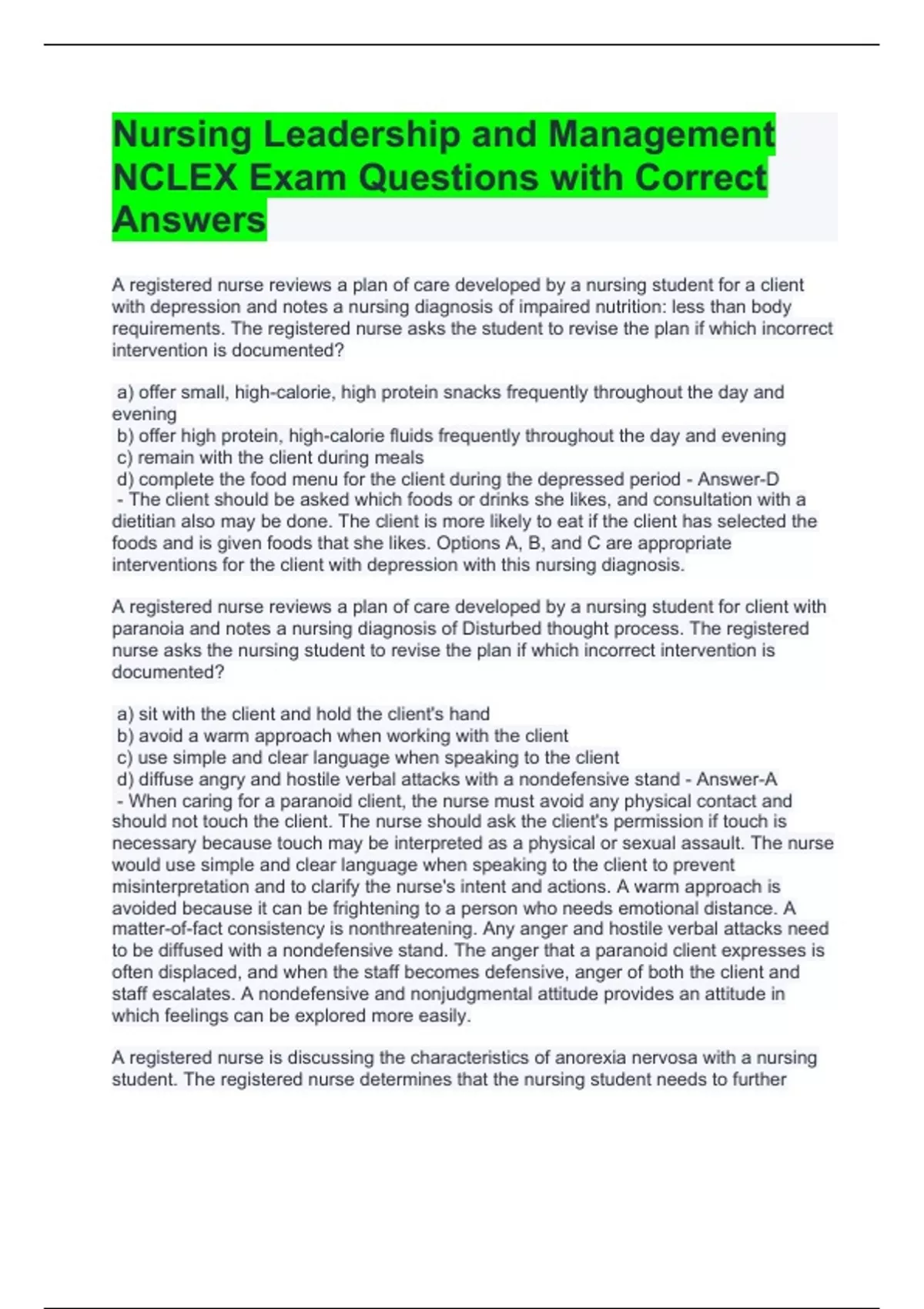 Nursing Leadership and Management NCLEX Exam Questions with Correct Answers
