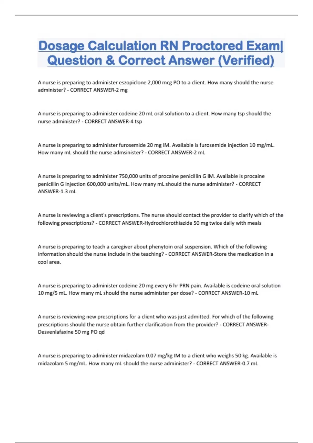 Dosage Calculation RN Proctored Exam| Question & Correct Answer (Verified) A nurse is preparing to administer eszopiclone 2,000 mcg PO to a client. How many should the nurse administer? - CORRECT ANSWER-2 mg A nurse is preparing to administer codeine 20 mL oral solution to a client. How many tsp should the nurse administer? - CORRECT ANSWER-4 tsp A nurse is preparing to administer furosemide 20 mg IM. Available is furosemide injection 10 mg/mL. How many mL should the nurse admsinister? - CORRECT ANSWER-2 mL