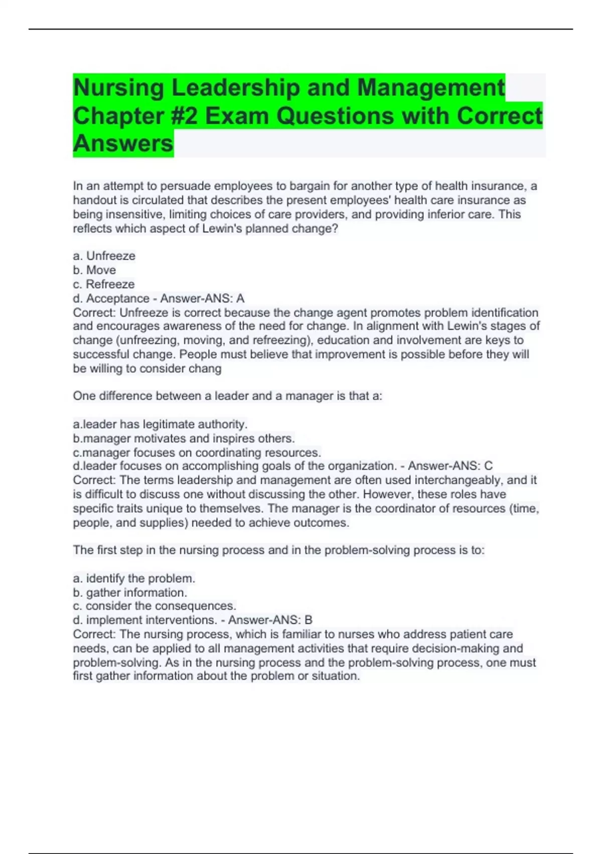 Nursing Leadership and Management Chapter #2 Exam Questions with Correct Answers