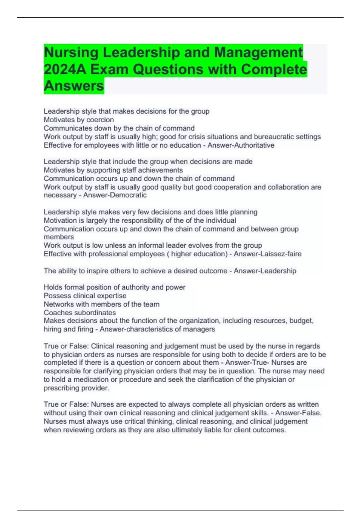 Nursing Leadership and Management 2024A Exam Questions with Complete Answers
