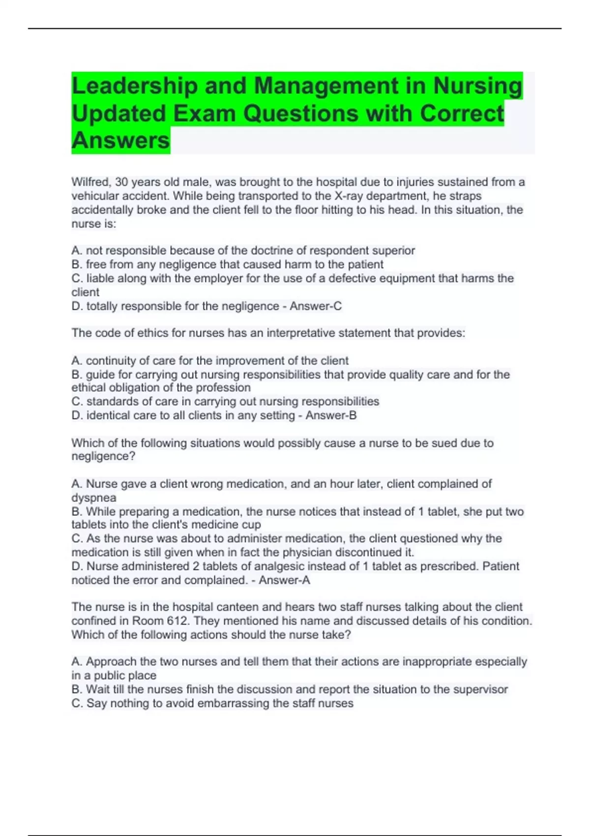 Leadership and Management in Nursing Updated Exam Questions with Correct Answers