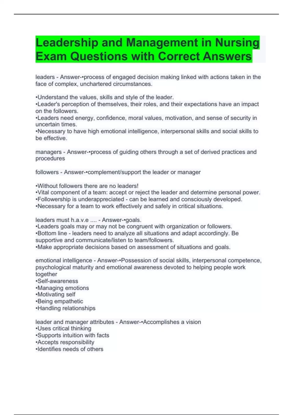 Leadership and Management in Nursing Exam Questions with Correct Answers