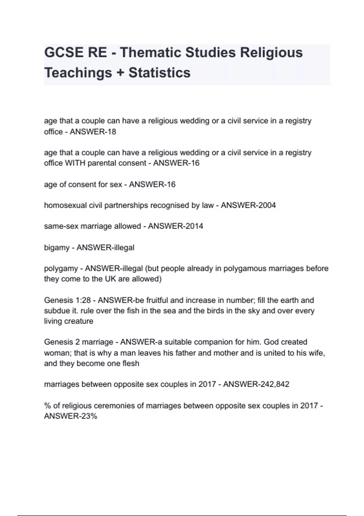 GCSE RE - Thematic Studies Religious Teachings + Statistics with complete solution