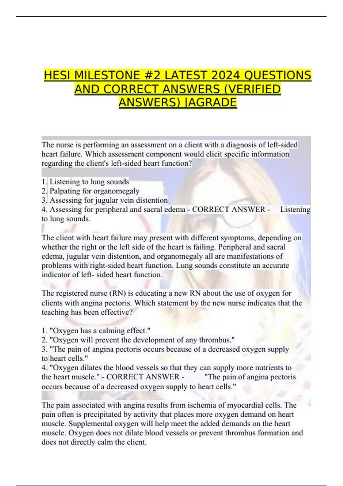 HESI MILESTONE #2 LATEST 2024 QUESTIONS AND CORRECT ANSWERS (VERIFIED ANSWERS) |AGRADE HESI MILESTONE #2 LATEST 2024 QUESTIONS AND CORRECT ANSWERS (VERIFIED ANSWERS) |AGRADE The nurse is performing an assessment on a client with a diagnosis of left-sided heart failure. Which assessment component would elicit specific information regarding the client's left-sided heart function? 1. Listening to lung sounds 2. Palpating for organomegaly 3. Assessing for jugular vein distention 4. Assessing for peripheral and sacral edema - CORRECT ANSWER - Listening to lung sounds. The client with heart failure may present with different symptoms, depending on whether the right or the left side of the heart is failing. Peripheral and sacral edema, jugular vein distention, and organomegaly all are manifestations of problems with right-sided heart function. Lung sounds constitute an accurate indicator of left- sided heart function. The registered nurse (RN) is educating a new RN about the use of oxygen for clients with angina pectoris. Which statement by the new nurse indicates that the teaching has been effective? 1. "Oxygen has a calming effect." 2. "Oxygen will prevent the development of any thrombus." 3. "The pain of angina pectoris occurs because of a decreased oxygen supply to heart cells." 4. "Oxygen dilates the blood vessels so that they can supply more nutrients to the heart muscle." - CORRECT ANSWER - "The pain of angina pectoris occurs because of a decreased oxygen supply to heart cells." The pain associated with angina results from ischemia of myocardial cells. The pain often is precipitated by activity that places more oxygen demand on heart muscle. Supplemental oxygen will help meet the added demands on the heart muscle. Oxygen does not dilate blood vessels or prevent thrombus formation and does not directly calm the client. The nurse has provided dietary instructions to a client with coronary artery disease. Which statement by the client indicates an understanding of the dietary instructions? 1. "I'll need to become a strict vegetarian." 2. "I should use polyunsaturated oils in my diet." 3. "I need to substitute eggs and whole milk for meat." 4. "I should eliminate all cholesterol and fat from my diet." - CORRECT ANSWER - "I should use polyunsaturated oils in my diet." The client with coronary artery disease needs to avoid foods high in saturated fat and cholesterol such as eggs, whole milk, and red meat. These foods contribute to increases in low-density lipoproteins. The use of polyunsaturated oils is recommended to control hypercholesterolemia. It is not necessary to eliminate all cholesterol and fat from the diet. It is not necessary to become a strict vegetarian. The home care nurse has taught a client with heart failure and a problem of inadequate cardiac output about helpful lifestyle adaptations to promote health. Which statement by the client best demonstrates an understanding of the information provided? 1. "I will try to exercise vigorously to strengthen my heart muscle." 2. "I will eat enough daily fiber to prevent straining during bowel movement." 3. "I will drink 3000 to 3500 mL of fluid daily to promote good kidney function." 4. "Drinking 2 to 3 oz of liquor each night will promote blood flow by enlarging blood vessels." - CORRECT ANSWER - "I will eat enough daily fiber to prevent straining during bowel movement." Standard home care instructions for a client with this problem include, among others, lifestyle changes such as avoiding alcohol intake, avoiding activities that increase the demands on the heart, instituting a bowel regimen to prevent straining and constipation, and maintaining fluid and electrolyte balance. Consuming 3000 to 3500 mL of fluid and exercising vigorously will increase the cardiac workload. A client with heart failure has been experiencing difficulty with completion of daily activities, as evidenced by exertional fatigue and increased blood pressure. Which observation by the nurse best indicates client progress in meeting goals for this problem? 1. Ambulates 10 feet (3 meters) farther each day 2. Verbalizes the benefits of increasing activity 3. Chooses a healthy diet that meets caloric needs 4. Sleeps without awakening throughout the night - CORRECT ANSWER - Chooses a healthy diet that meets caloric needs Each of the options indicates a positive outcome on the part of the client. Both option 2 and the correct one relate to the client problem of difficulty with completion of daily activities. However, the question asks about progress. The correct option is more action-oriented and therefore is the better choice. Option 3 would most likely indicate progress if the client had a problem of inadequate nutritional intake. Option 4 would be a satisfactory outcome for a client experiencing difficulty sleeping. A client with coronary artery disease is scheduled to have a diagnostic exercise stress test. Which instruction would the nurse plan to provide to the client about this procedure? 1. Eat breakfast just before the procedure. 2. Wear firm, rigid shoes, such as work boots. 3. Wear loose clothing with a shirt that buttons in front. 4. Avoid cigarettes for 30 minutes before the procedure. - CORRECT ANSWER - Wear loose clothing with a shirt that buttons in front. The client needs to wear loose, comfortable clothing for the procedure. Electrocardiogram (ECG) lead placement is enhanced if the client wears a shirt that buttons in the front. The client needs to receive nothing by mouth after bedtime or for a minimum of 2 hours before the test. The client would wear rubber-soled, supportive shoes, such as athletic training shoes. The client needs to avoid smoking, alcohol, and caffeine on the day of the test. Inadequate or incorrect preparation can interfere with the test, with the potential for a false-positive result. A client recovering from pulmonary edema is preparing for discharge. What would the nurse plan to teach the client to do to manage or prevent recurre