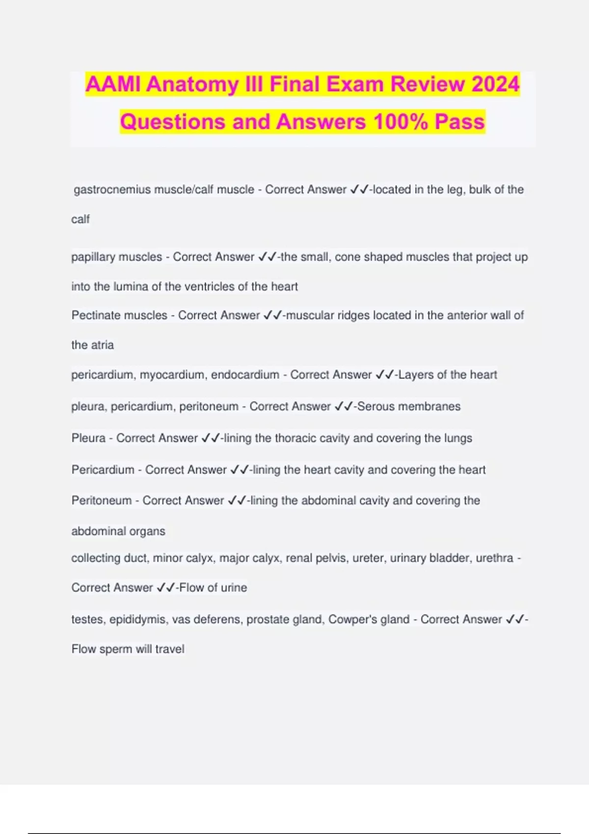 AAMI Anatomy III Final Exam Review 2024 Questions and Answers 100% Pass gastrocnemius muscle/calf muscle - Correct Answer ️️ -located in the leg, bulk of the calf papillary muscles - Correct Answer ️️ -the small, cone shaped muscles that project up into the lumina of the ventricles of the heart Pectinate muscles - Correct Answer ️️ -muscular ridges located in the anterior wall of the atria pericardium, myocardium, endocardium - Correct Answer ️️ -Layers of the heart pleura, pericardium, peritoneum - Correct Answer ️️ -Serous membranes Pleura - Correct Answer ️️ -lining the thoracic cavity and covering the lungs Pericardium - Correct Answer ️️ -lining the heart cavity and covering the heart Peritoneum - Correct Answer ️️ -lining the abdominal cavity and covering the abdominal organs collecting duct, minor calyx, major calyx, renal pelvis, ureter, urinary bladder, urethra - Correct Answer ️️ -Flow of urine testes, epididymis, vas deferens, prostate gland, Cowper's gland - Correct Answer ️️ - Flow sperm will travel lactiferous duct, lactiferous sinus, lactiferous tubule, nipple - Correct Answer ️️ -Flow of milk renal capsule, adipose capsule, renal fascia - Correct Answer ️️ -Layers of the kidney in order LV, RA - Correct Answer ️️ -Heart chambers in which coronary circulation begins and ends LV, RA - Correct Answer ️️ -Heart chambers in which systemic circulation begins and ends RV, LA - Correct Answer ️️ -Heart chambers in which pulmonary begins and ends liver - Correct Answer ️️ -Where does portal system terminate medulla oblongata, pons, midbrain - Correct Answer ️️ -Parts of Brainstem Medulla oblongata - Correct Answer ️️ -most inferior portion that controls heart rate, respiration, and digestion