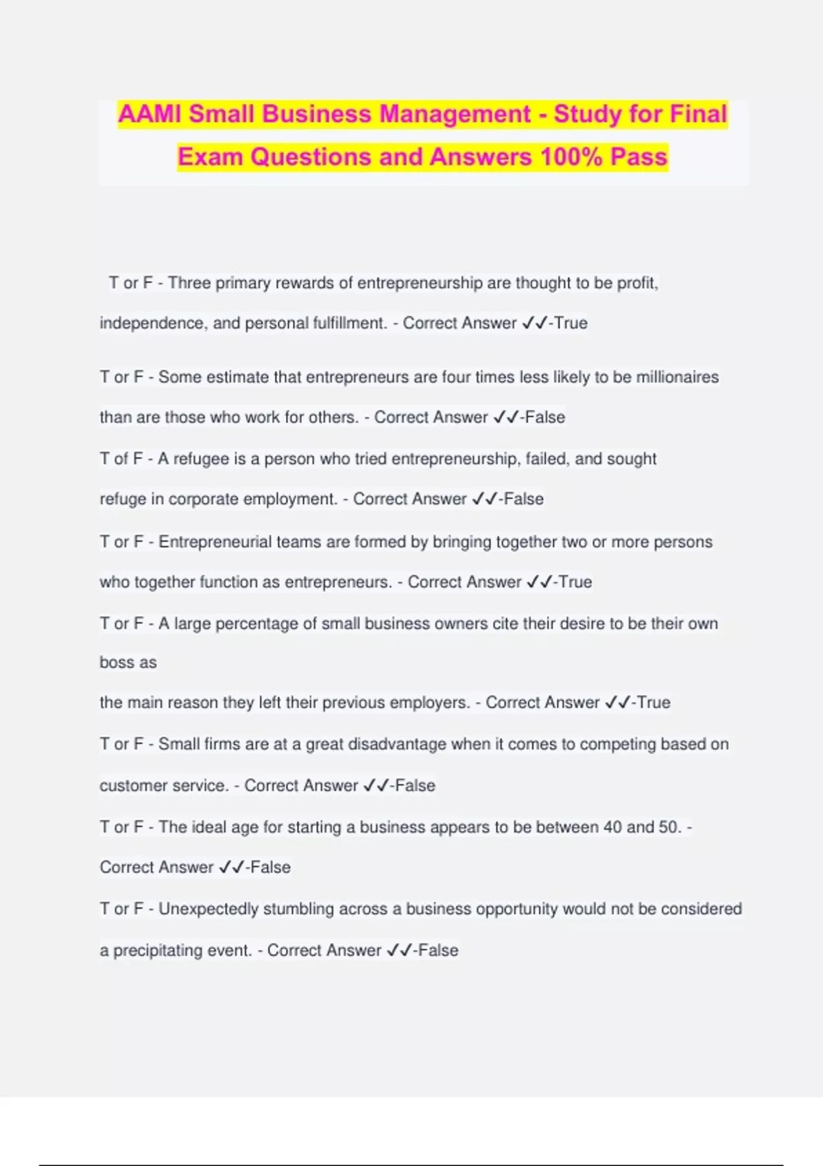 AAMI Small Business Management - Study for Final Exam Questions and Answers 100% Pass T or F - Three primary rewards of entrepreneurship are thought to be profit, independence, and personal fulfillment. - Correct Answer ️️ -True T or F - Some estimate that entrepreneurs are four times less likely to be millionaires than are those who work for others. - Correct Answer ️️ -False T of F - A refugee is a person who tried entrepreneurship, failed, and sought refuge in corporate employment. - Correct Answer ️️ -False T or F - Entrepreneurial teams are formed by bringing together two or more persons who together function as entrepreneurs. - Correct Answer ️️ -True T or F - A large percentage of small business owners cite their desire to be their own boss as the main reason they left their previous employers. - Correct Answer ️️ -True T or F - Small firms are at a great disadvantage when it comes to competing based on customer service. - Correct Answer ️️ -False T or F - The ideal age for starting a business appears to be between 40 and 50. - Correct Answer ️️ -False T or F - Unexpectedly stumbling across a business opportunity would not be considered a precipitating event. - Correct Answer ️️ -False Which of the following is classified as an entrepreneur? - Correct Answer ️️ -An owner- manager who bought out the founder of a firm The size standard for small business used in this course would exclude firms that - Correct Answer ️️ -have more than 100 employees. When a 32-year-old funeral director launches a funeral firm after seven years' experience in that industry, he - Correct Answer ️️ -is launching his venture into small business entrepreneurship. Which of the following situations might be a precipitating event? - Correct Answer ️️ - Getting laid off by General Motors. An entrepreneur's concern that his values continued to be reflected in the ways in which his firm conducts business after he retires is an example of the concept of ________. - Correct Answer ️️ -entrepreneurial legacy T or F - Small businesses that practice skimming of income are acting ethically and legally. - Correct Answer ️️ -False T or F - Temptations and pressures to act unethically are thought to be greater in big business than in small business. - Correct Answer ️️ -False T or F - Small firm owners may be tempted to rationalize bribery or other unethical behavior as a way of offsetting what seems to be a competitive disadvantage. - Correct Answer ️️ - True T or F - Better Business Bureaus serve primarily as assistants to district attorneys, helping expose corrupt business practices. - Correct Answer ️️ -False