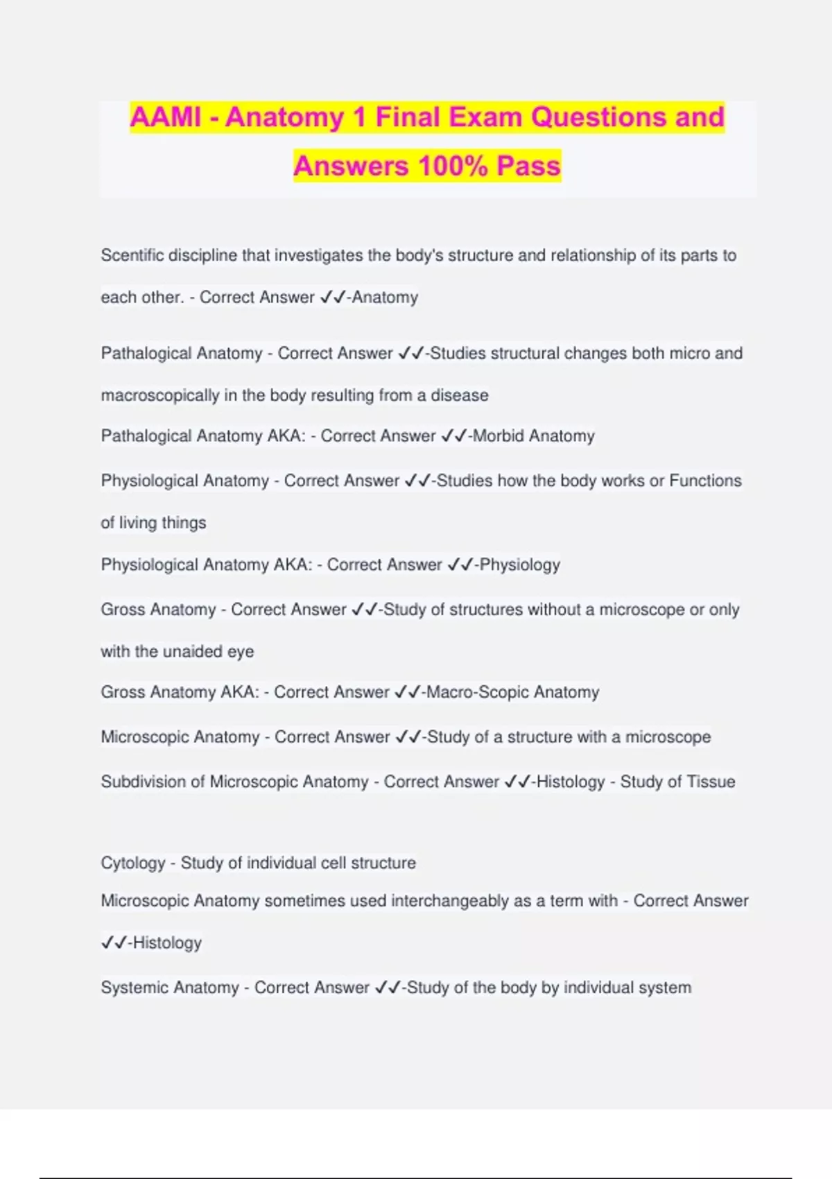 AAMI - Anatomy 1 Final Exam Questions and Answers 100% Pass Scentific discipline that investigates the body's structure and relationship of its parts to each other. - Correct Answer ️️ -Anatomy Pathalogical Anatomy - Correct Answer ️️ -Studies structural changes both micro and macroscopically in the body resulting from a disease Pathalogical Anatomy AKA: - Correct Answer ️️ -Morbid Anatomy Physiological Anatomy - Correct Answer ️️ -Studies how the body works or Functions of living things Physiological Anatomy AKA: - Correct Answer ️️ -Physiology Gross Anatomy - Correct Answer ️️ -Study of structures without a microscope or only with the unaided eye Gross Anatomy AKA: - Correct Answer ️️ -Macro-Scopic Anatomy Microscopic Anatomy - Correct Answer ️️ -Study of a structure with a microscope Subdivision of Microscopic Anatomy - Correct Answer ️️ -Histology - Study of Tissue Cytology - Study of individual cell structure Microscopic Anatomy sometimes used interchangeably as a term with - Correct Answer ️️ -Histology Systemic Anatomy - Correct Answer ️️ -Study of the body by individual system Regional Anatomy - Correct Answer ️️ -Study of a particular body region Describe Anatomical Position (5) - Correct Answer ️️ -Standing Erect Facing Observer Feet flat on the floor Upper extremities at sides Palms facing Anteriorly Prone - Correct Answer ️️ -Anterior Surface down / lying face up Supine - Correct Answer ️️ -Anterior surface up / lying face down Anterior - Correct Answer ️️ -AKA: Ventral Closer to the front of the body Posterior - Correct Answer ️️ -AKA: Dorsal Closer to the back of the body Medial - Correct Answer ️️ -Toward the midline or mediam plane of the body Lateral - Correct Answer ️️ -Location away from the median plane Superior - Correct Answer ️️ -Toward head Upper part of the body Away from feet Superior AKA: (3) - Correct Answer ️️ -Cephalad Cephalic Cranial Inferior - Correct Answer ️️ -Located toward the tail end or the inferior end of the body or away from the head Inferior AKA: - Correct Answer ️️ -Caudal Proximal literally means ______. - Correct Answer ️️ -Nearest Proximal - Correct Answer ️️ -Located closer to the point of attachment of a limb to the trunk of the body