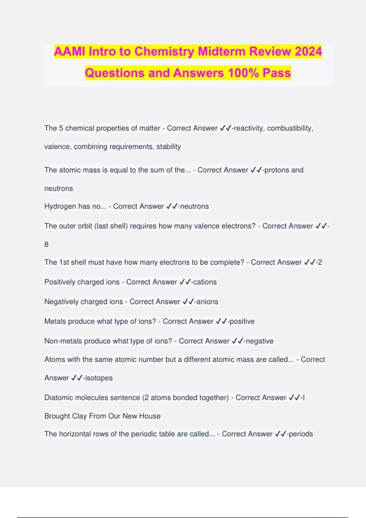 AAMI Intro to Chemistry Midterm Review 2024 Questions and Answers 100% Pass The 5 chemical properties of matter - Correct Answer ️️ -reactivity, combustibility, valence, combining requirements, stability The atomic mass is equal to the sum of the... - Correct Answer ️️ -protons and neutrons Hydrogen has no... - Correct Answer ️️ -neutrons The outer orbit (last shell) requires how many valence electrons? - Correct Answer ️️ - 8 The 1st shell must have how many electrons to be complete? - Correct Answer ️️ -2 Positively charged ions - Correct Answer ️️ -cations Negatively charged ions - Correct Answer ️️ -anions Metals produce what type of ions? - Correct Answer ️️ -positive Non-metals produce what type of ions? - Correct Answer ️️ -negative Atoms with the same atomic number but a different atomic mass are called... - Correct Answer ️️ -isotopes Diatomic molecules sentence (2 atoms bonded together) - Correct Answer ️️ -I Brought Clay From Our New House The horizontal rows of the periodic table are called... - Correct Answer ️️ -periods