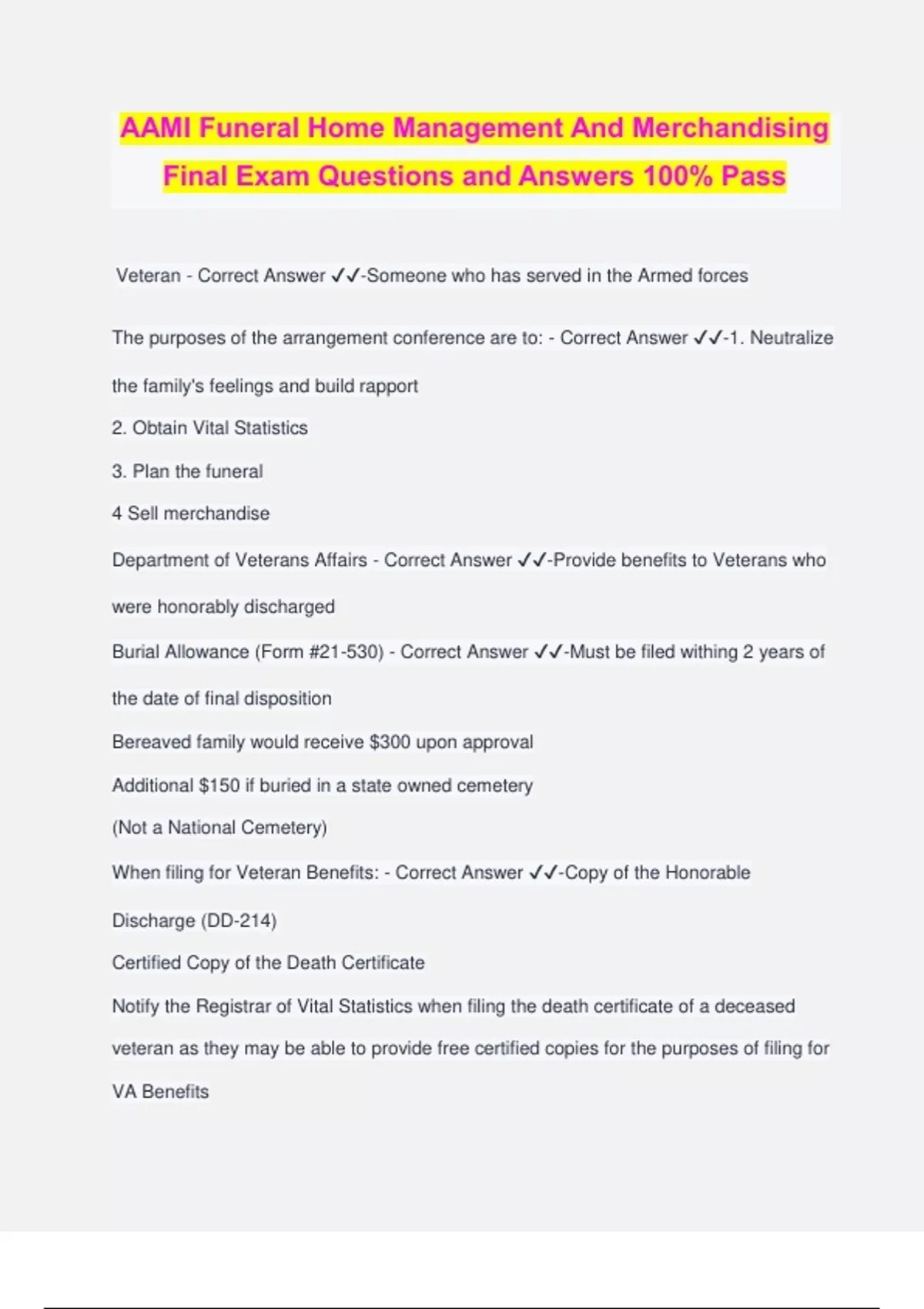 AAMI Funeral Home Management And Merchandising Final Exam Questions and Answers 100% Pass Veteran - Correct Answer ️️ -Someone who has served in the Armed forces The purposes of the arrangement conference are to: - Correct Answer ️️ -1. Neutralize the family's feelings and build rapport 2. Obtain Vital Statistics 3. Plan the funeral 4 Sell merchandise Department of Veterans Affairs - Correct Answer ️️ -Provide benefits to Veterans who were honorably discharged Burial Allowance (Form #21-530) - Correct Answer ️️ -Must be filed withing 2 years of the date of final disposition Bereaved family would receive $300 upon approval Additional $150 if buried in a state owned cemetery (Not a National Cemetery) When filing for Veteran Benefits: - Correct Answer ️️ -Copy of the Honorable Discharge (DD-214) Certified Copy of the Death Certificate Notify the Registrar of Vital Statistics when filing the death certificate of a deceased veteran as they may be able to provide free certified copies for the purposes of filing for VA Benefits Itemized copy of the funeral bill Completed form #21-530 Form #90-2008 - Correct Answer ️️ -Application for United States Flag for Burial Purposes When should you apply for a flag? - Correct Answer ️️ -Before the funeral takes place Where can you obtain a flag? - Correct Answer ️️ -At any first, second, or third class post office, at the fourth class post offices in the county seats or at any field station of the Veterans Administration (VA), including contact offices. The order of preference for signing the VA Form # 9 0-2008 is: - Correct Answer ️️ -1. Next of kin or other relative; 2. Person making the funeral arrangements; 3. Funeral director 4. Representative of a veterans' organization having charge of the funeral; 5. Other person having knowledge of the eligibility of the deceased and acting in the interest of his (or her) family. The order of preference to entitlement of the flag: - Correct Answer ️️ -1. Widow or widower 2. Children, according to age 3. Parents, adoptive parents, stepparents and foster parents 4. Brothers or sisters, including half-blood siblings 5. Uncles or aunts; 6. Nephews or nieces; 7. Others, cousins, grandparents, etc. If two relatives having equal entitlement request the flag? - Correct Answer ️️ -It would go to the elder of the two Can a flag be issued to a widow/widower who is separated from the deceased? - Correct Answer ️️ -Yes. As long as the widow/widower is not remarried. Can a flag be issued to a widow/widower who was separated from the deceased and then remarried? - Correct Answer ️️ -No. Unless the application for the flag was made prior to the remarriage. Form #40-1330 - Correct Answer ️️ -Application for Headstone / Marker. What is the time limit for filing for a Headstone/Marker? - Correct Answer ️️ -There is no time limit. The nearest relative, funeral director or other person may request a headstone or marker when: - Correct Answer ️️ -When interment is in a cemetery other than a Veterans Administration or National Cemetery Filing for a Headstone/Marker - Correct Answer ️️ -Completed form #40-1330 and a copy of Honorable Discharge (DD-214) The V.A. will pay the cost of transportation when: - Correct Answer ️️ -When a Veteran dies as a result of a Service-Connect