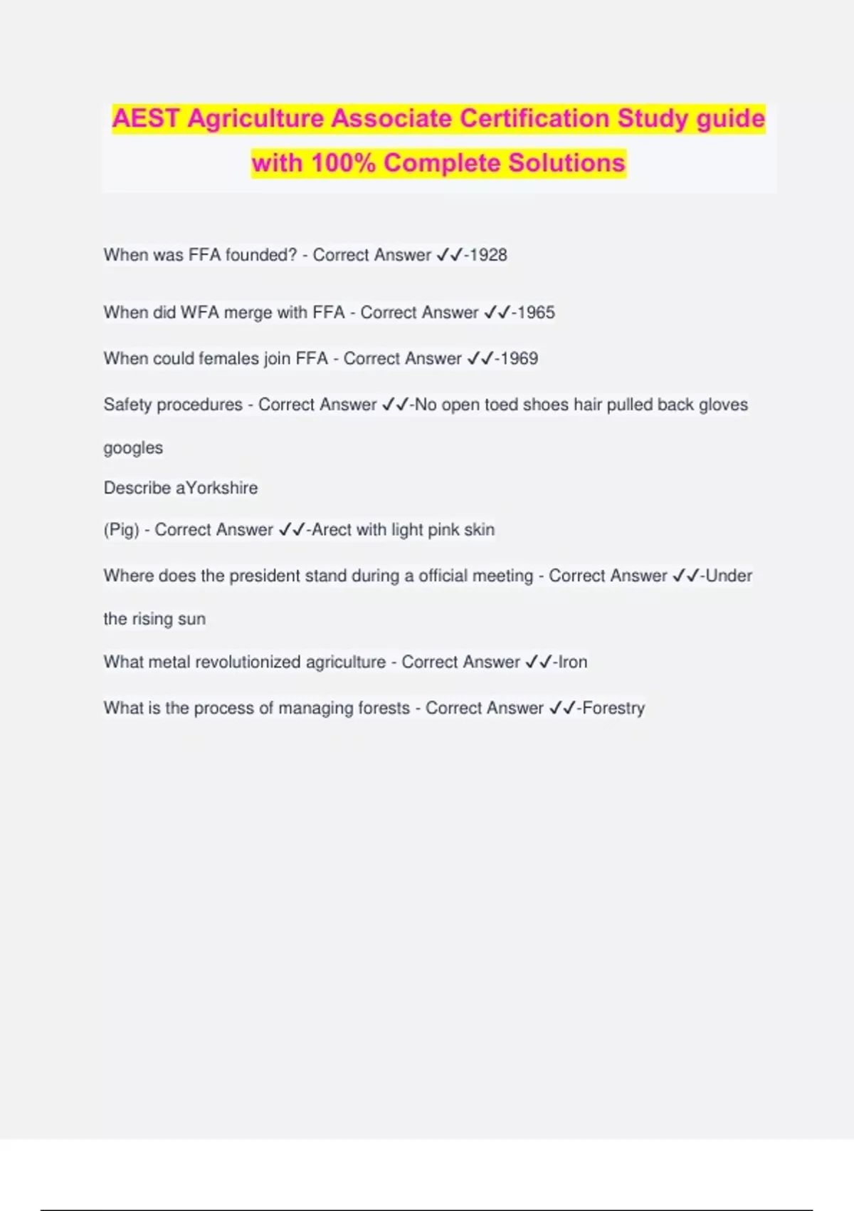 AEST Agriculture Associate Certification Study guide with 100% Complete Solutions When was FFA founded? - Correct Answer ️️ -1928 When did WFA merge with FFA - Correct Answer ️️ -1965 When could females join FFA - Correct Answer ️️ -1969 Safety procedures - Correct Answer ️️ -No open toed shoes hair pulled back gloves googles