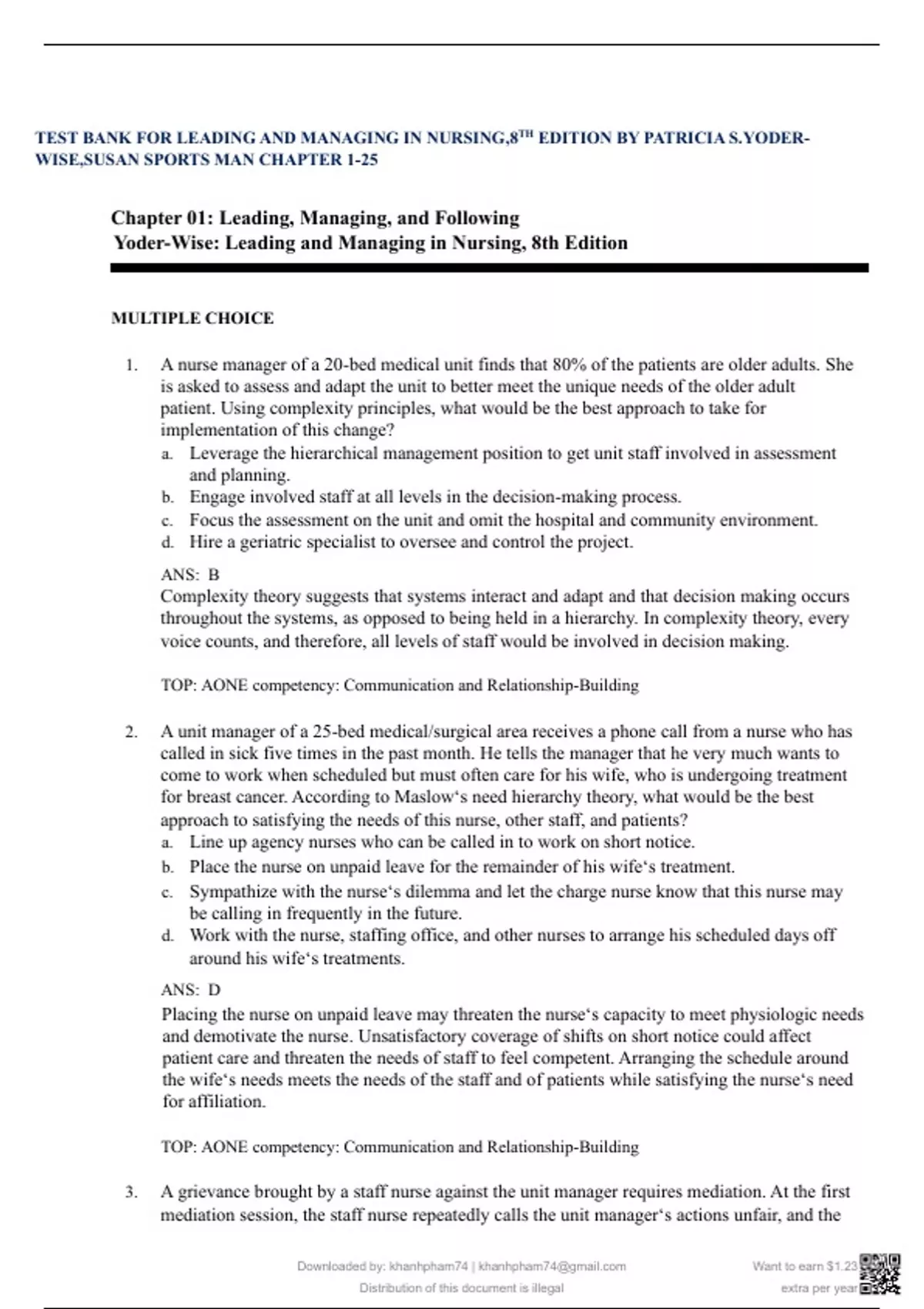 TEST BANK FOR LEADING AND MANAGING IN NURSING,8TH EDITION BY PATRICIA S.YODERWISE,SUSAN SPORTS MAN CHAPTER 1-25