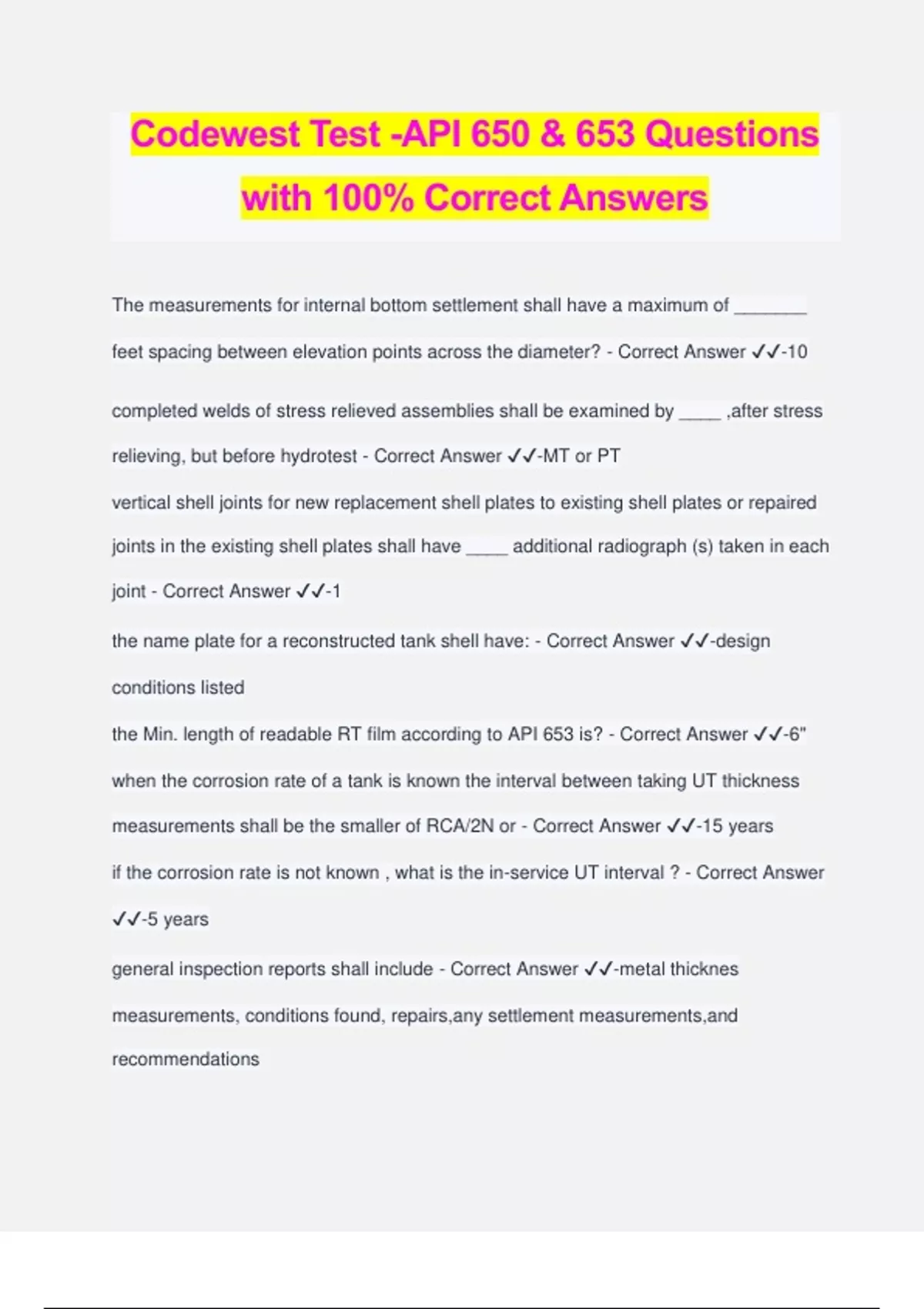 Codewest Test -API 650 & 653 Questions with 100% Correct Answers The measurements for internal bottom settlement shall have a maximum of _______ feet spacing between elevation points across the diameter? - Correct Answer ️️ -10 completed welds of stress relieved assemblies shall be examined by ____ ,after stress relieving, but before hydrotest - Correct Answer ️️ -MT or PT vertical shell joints for new replacement shell plates to existing shell plates or repaired joints in the existing shell plates shall have ____ additional radiograph (s) taken in each joint - Correct Answer ️️ -1 the name plate for a reconstructed tank shell have: - Correct Answer ️️ -design conditions listed the Min. length of readable RT film according to API 653 is? - Correct Answer ️️ -6" when the corrosion rate of a tank is known the interval between taking UT thickness measurements shall be the smaller of RCA/2N or - Correct Answer ️️ -15 years if the corrosion rate is not known , what is the in-service UT interval ? - Correct Answer ️️ -5 years general inspection reports shall include - Correct Answer ️️ -metal thicknes measurements, conditions found, repairs,any settlement measurements,and recommendations