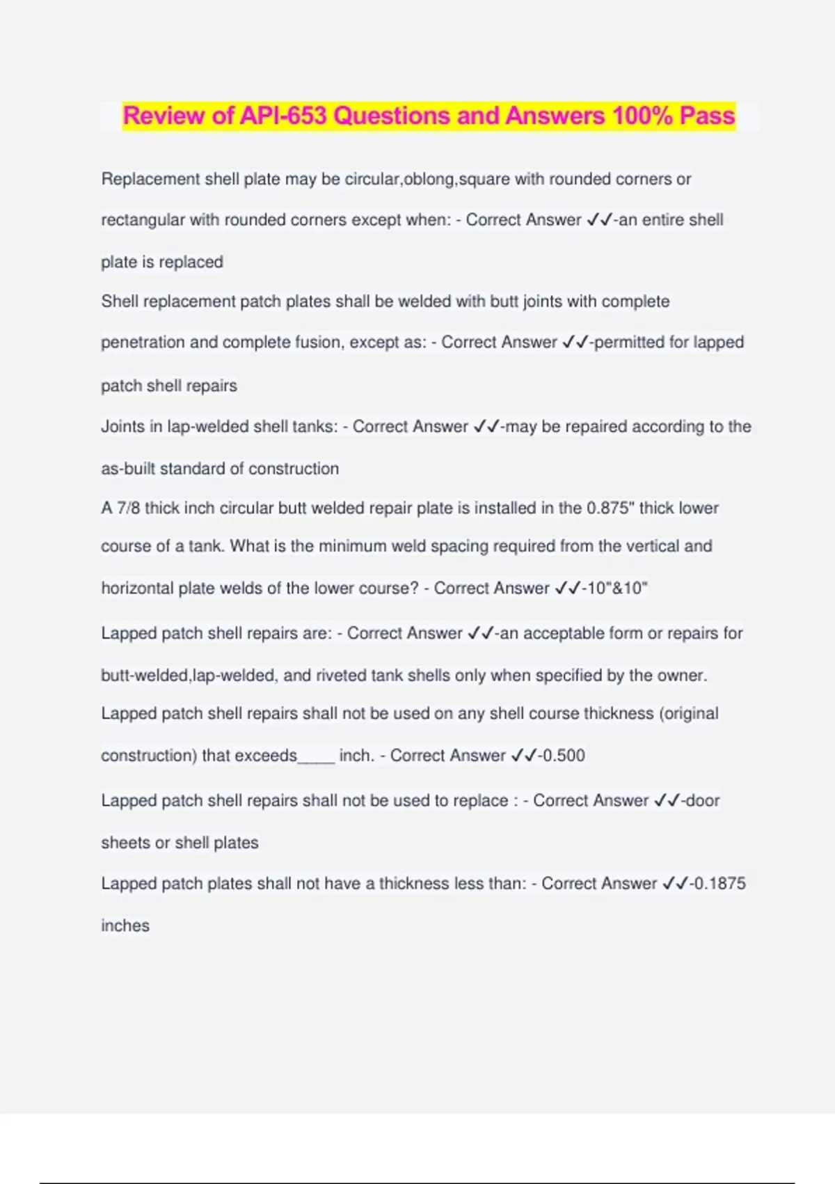 Review of API-653 Questions and Answers 100% Pass Replacement shell plate may be circular,oblong,square with rounded corners or rectangular with rounded corners except when: - Correct Answer ️️ -an entire shell plate is replaced Shell replacement patch plates shall be welded with butt joints with complete penetration and complete fusion, except as: - Correct Answer ️️ -permitted for lapped patch shell repairs Joints in lap-welded shell tanks: - Correct Answer ️️ -may be repaired according to the as-built standard of construction A 7/8 thick inch circular butt welded repair plate is installed in the 0.875" thick lower course of a tank. What is the minimum weld spacing required from the vertical and horizontal plate welds of the lower course? - Correct Answer ️️ -10"&10" Lapped patch shell repairs are: - Correct Answer ️️ -an acceptable form or repairs for butt-welded,lap-welded, and riveted tank shells only when specified by the owner. Lapped patch shell repairs shall not be used on any shell course thickness (original construction) that exceeds____ inch. - Correct Answer ️️ -0.500 Lapped patch shell repairs shall not be used to replace : - Correct Answer ️️ -door sheets or shell plates Lapped patch plates shall not have a thickness less than: - Correct Answer ️️ -0.1875 inches