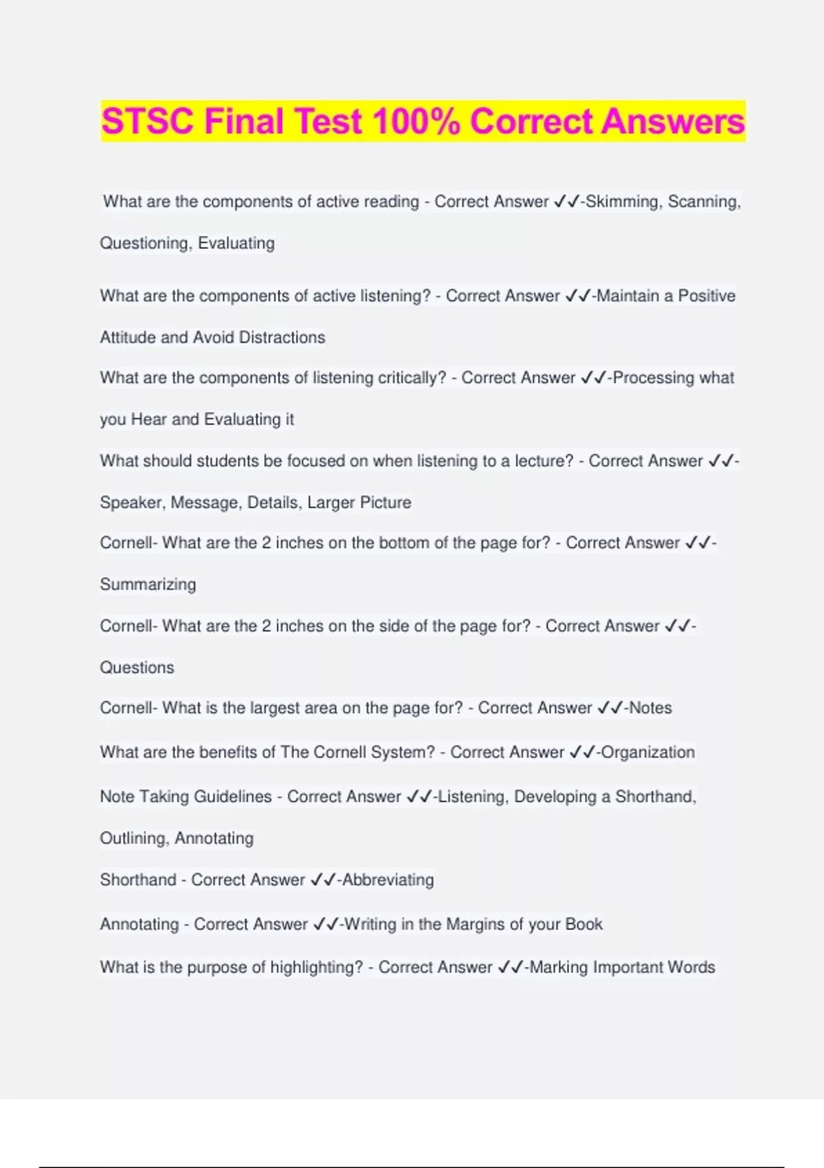 STSC Final Test 100% Correct Answers What are the components of active reading - Correct Answer ️️ -Skimming, Scanning, Questioning, Evaluating What are the components of active listening? - Correct Answer ️️ -Maintain a Positive Attitude and Avoid Distractions What are the components of listening critically? - Correct Answer ️️ -Processing what you Hear and Evaluating it What should students be focused on when listening to a lecture? - Correct Answer ️️ - Speaker, Message, Details, Larger Picture Cornell- What are the 2 inches on the bottom of the page for? - Correct Answer ️️ - Summarizing Cornell- What are the 2 inches on the side of the page for? - Correct Answer ️️ - Questions Cornell- What is the largest area on the page for? - Correct Answer ️️ -Notes What are the benefits of The Cornell System? - Correct Answer ️️ -Organization Note Taking Guidelines - Correct Answer ️️ -Listening, Developing a Shorthand, Outlining, Annotating Shorthand - Correct Answer ️️ -Abbreviating Annotating - Correct Answer ️️ -Writing in the Margins of your Book What is the purpose of highlighting? - Correct Answer ️️ -Marking Important Words When should students review their notes? - Correct Answer ️️ -asap Chronological - Correct Answer ️️ -Details arranged in time Compare/Contrast - Correct Answer ️️ -Details arranged by similarities and differences Most Important/Least Important - Correct Answer ️️ -Details arranged in order of importance VARK - Correct Answer ️️ -Visual Aural Read/Write Kinesthetic What is VARK? - Correct Answer ️️ -A questionnaire that provides users with a profile of their learning preferences What are Mnemonic Devices? - Correct Answer ️️ -Memory Aids Acronym - Correct Answer ️️ -An Abbreviation of a Phrase or Word Chunking - Correct Answer ️️ -Grouping Words or Numbers Cramming - Correct Answer ️️ -Trying to Remember a Large Amount of Material in a Short Period of Time Loci Method - Correct Answer ️️ -associating info with an object or place Long-term Memory - Correct Answer ️️ -Memory that Lasts Longer than a Few Days