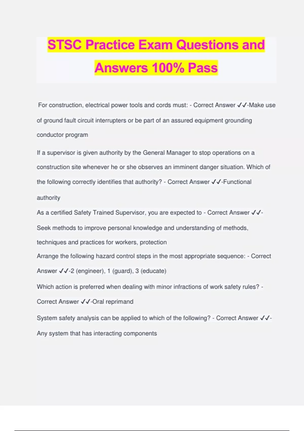 STSC Practice Exam Questions and Answers 100% Pass For construction, electrical power tools and cords must: - Correct Answer ️️ -Make use of ground fault circuit interrupters or be part of an assured equipment grounding conductor program If a supervisor is given authority by the General Manager to stop operations on a construction site whenever he or she observes an imminent danger situation. Which of the following correctly identifies that authority? - Correct Answer ️️ -Functional authority As a certified Safety Trained Supervisor, you are expected to - Correct Answer ️️ - Seek methods to improve personal knowledge and understanding of methods, techniques and practices for workers, protection Arrange the following hazard control steps in the most appropriate sequence: - Correct Answer ️️ -2 (engineer), 1 (guard), 3 (educate) Which action is preferred when dealing with minor infractions of work safety rules? - Correct Answer ️️ -Oral reprimand System safety analysis can be applied to which of the following? - Correct Answer ️️ - Any system that has interacting components What should a supervisor do when a crew must walk across an area with open floor holes to get to their work area? - Correct Answer ️️ -Have the floor holes covered and inform crew of load surface restrictions The strongest motivator, according to the Contemporary Motivation Theory is: - Correct Answer ️️ -Recognition of achievement Management has increased work hours and is pushing for more productivity. As STS, you are concerned about some of the safety risks associated with this production schedule. You should: - Correct Answer ️️ -Inform/ communicate increased hazards due to increased production and verify that risk is acceptable The best evaluation of tasks descriptor involving steps, hazards and solutions is? - Correct Answer ️️ -Job Safety Analysis (JSA) What minimum PPE is required for a worker using a jackhammer with a spade to remove asphalt? - Correct Answer ️️ -Hearing, eye, head and foot protection Minimally, _____ designated person(s) shall be on duty above ground whenever any employee is working underground and shall be responsible for securing immediate aid, keeping an accurate count of employees underground in case of emergency. - Correct Answer ️️ -One A medical questionnaire required when safety workers place an employee in respiratory protection must be evaluated by whom? - Correct Answer ️️ -A licensed health care professional In construction each employee on a walking/ working surface (horizontal and vertical surface) with an unprotected side or edge which is _____ feet or move above a lower level shall be protected from falling by the use of guardrail systems, safety net systems, or personal fall arrest systems. - Correct Answer ️️ -6 A crew member deliberately violates a safety procedure. What should be done? - Correct Answer ️️ -Stop work, write formal complaint and explain OSHA requires that each employee on a scaffold more than _____ feet above a lower level shall be provided with fall protection with fall protection to prevent from falling to that lower level. - Correct Answer ️️ -10 Professional ethics refers to: - Correct Answer ️️ -A set of principles and standards that guide the actions of professionals that are often referenced in civil or criminal cases involving professional conduct When working on a scaffold 50 feet high who must approve the scaffold for use? - Correct Answer ️️ -The Competent person