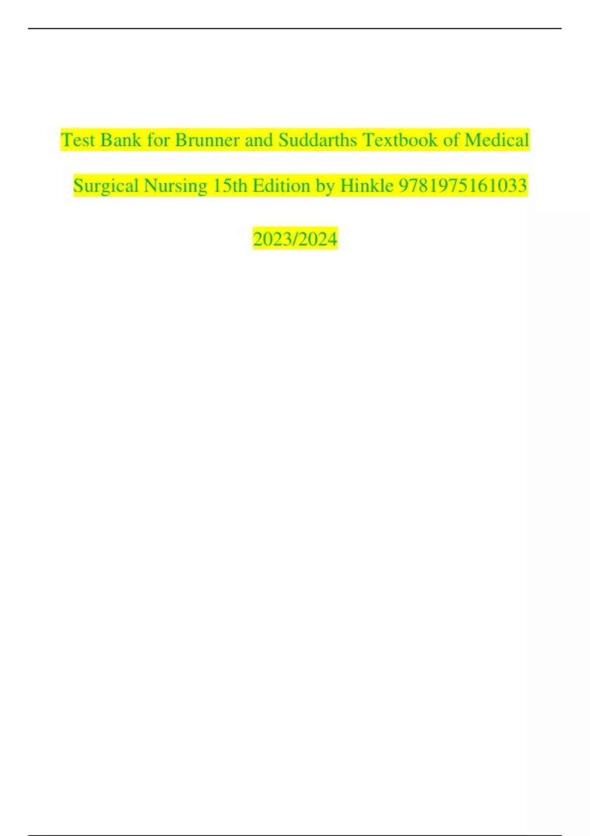 lOMoARc PSD|9648155 Test Bank for Brunner and Suddarths Textbook of Medical Surgical Nursing 15th Edition by Hinkle 9781975161033 2023/2024 StuDocu is not sponsored or endorsed by any college or university Downloaded by Yug Navillus () lOMoAR cPSD|9648155 Test Bank For Brunner and Suddarths Textbook of Medical Surgical Nursing 15th Edition by Hinkle Test Bank Click Here To Access The FULL VERSION Chapter 2: Medical -Surgical Nursing 1. The nurse navigator is coordinating the transition from the hospital to a rehabilitation facility of a client who had a total hip replacement. Which activity would be an example of the nurse navigator role for this client? A. Ensuring cost-effective care B. Communicating with the medical insurance company C. Educating the client on the goals of rehabilitation D. Providing direct care to the client ANS: C Rationale: The role of the nurse navigator is to assist clients with transitions in different levels of care, such as from the hospital to a rehabilitation facility. It is the role of a case manager to ensure cost -effective care and to communicate with the medical insurance company. The nurse navigator does not provide direct care to clients. PTS: 1 REF: p. 35 NAT: Client Needs: Safe, Effective Care Environment: Management of Care TOP: Chapter 2: Medical -Surgical Nursing KEY: Integrated Process: Nursing Process BLM: Cognitive Level: Understand NOT: Multiple Choice 2. The nursing instructor is preparing a group of students for their home care rotation. Which of the following types of care are the students most likely to provide? A. Primary care B. Assistance with food shopping C. Performing household chores lOMoAR cPSD|9648155 Test Bank For Brunner and Suddarths Textbook of Medical Surgical Nursing 15th Edition by Hinkle Test Bank Click Here To Access The FULL VERSION D. Skilled nursing care ANS: D