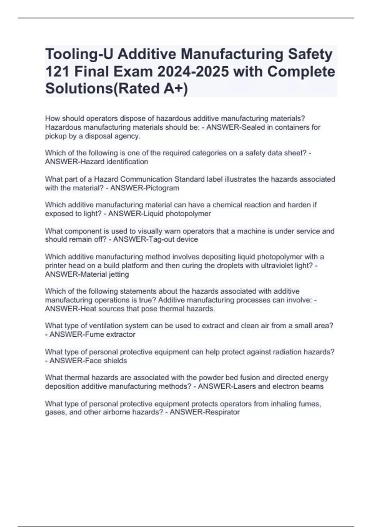 Tooling-U Additive Manufacturing Safety 121 Final Exam with Complete Solutions(Rated A+)